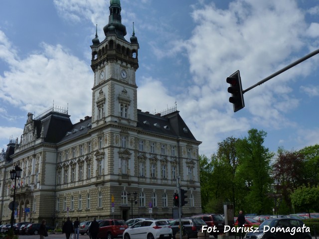 Bielska-Białej oraz Rady Miejskiej. Ratusz został zbudowany na planie wydłużonego prostokąta. Od strony zachodniej budynek ma dwa krótkie skrzydła. Ratusz jest budowlą trzykondygnacyjną. W północno-wschodnim narożniku gmachu znajduje się 52-metrowa wieża nakryta cebulastym, wielobocznym hełmem z galeryjką i iglicą w otoczeniu czterech narożnych kopułek. Na wieży umieszzony jest zegar, który co 3 godziny odtwarza hejnał miejski (fot.).