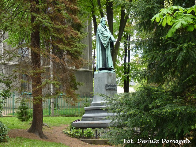 neogotyckim, w latach 1895-1896 podwyższono wieżę. Kościół jest świątynią trójnawową z krzyżowo-żebrowymi sklepieniami i dwukondygnacyjnymi, arkadowymi emporami. Od strony zachodniej wysoka wieża z ośmiobocznym hełmem i półokrągłymi wieżyczkami po bokach. Kościół posiada dwa portale: główny od strony zachodniej, zbudowany w latach 1849-1852 i boczny od strony południowej (1782-1790). W apsydzie ołtarz połączony z amboną. Organy z 1881 roku. Obok kościoła stoi jedyny na terenie Polski pomnik Marcina Lutra z 1900 roku (fot.).