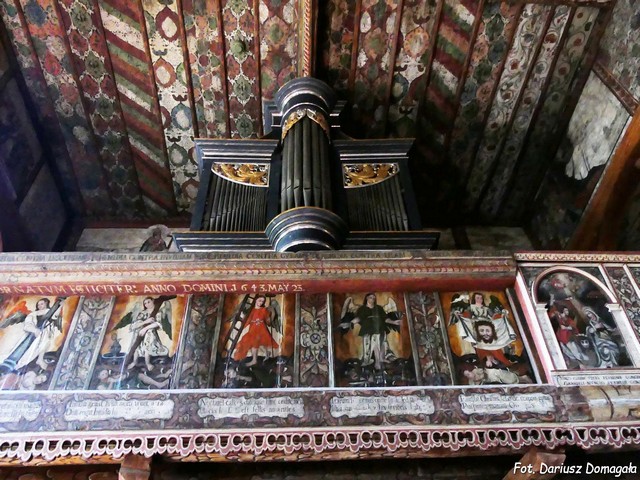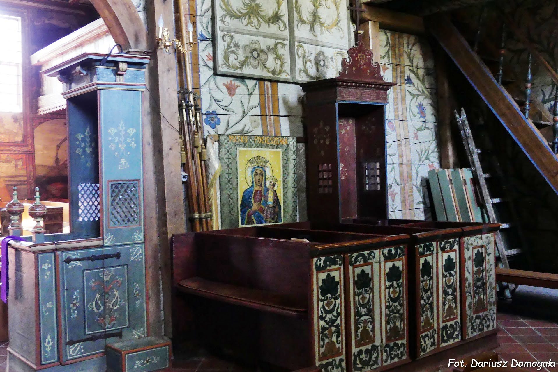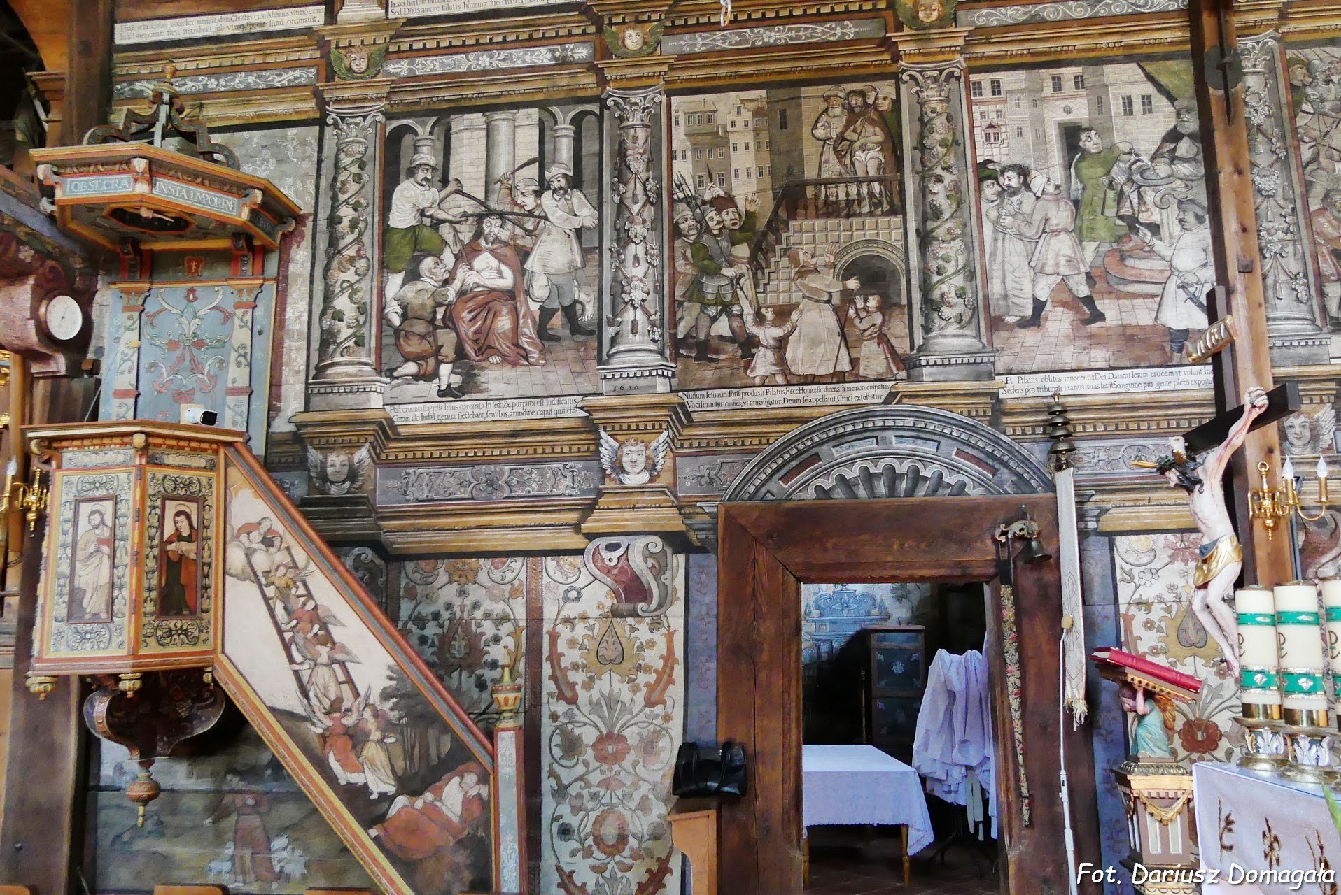 W 1844 roku przeprowadzono kolejny duży remont kościoła obejmujący także wyposażenie, rozebrano też soboty, które powstały przed 1601 rokiem. W latach 1890-1908 przeprowadzono prace zabezpieczające osłabioną konstrukcję kościoła przez co poważnie zniekształcono świątynię, m.in. poprzez zmianę pokrycia dachów z gontu na blachę, szalunek gontowy ścian zastąpiono deskowaniem, a zaskrzynienia w nawie podparto arkadami filarowymi. Kolejne remonty kościół przeszedł w latach 1953-1956 i w 1967. Pod koniec XX wieku podjęto zabiegi renowacyjne mające przywrócić pierwotny wygląd kościoła. Wymieniono wówczas gontowe pokrycie ścian, zrekonstruowano pierwotny kształt wieży, a na początku XXI wieku przeprowadzono remont więźby dachowej z wymianą pokrycia na gontowe. W latach 2010-2012 były prowadzono prace renowacyjne we wnętrzu kościoła. Kościół został wpisany w 2003 roku na Listę Światowego Dziedzictwa UNESCO i znajduje się na Szlaku Architektury Drewnianej Województwa Małopolskiego. Kościół jest orientowany, konstrukcji zrębowej z drewna jodłowego, jednonawowy, z dobudowaną wieżą od zachodu (fot.) (fot.). Do prawie kwadratowej nawy przylega węższe, prostokątne prezbiterium zamknięte trójbocznie od wschodu z dostawioną od północy zakrystią. Od północy do nawy przylega kaplica Aniołów Stróżów, a od południa kruchta. Wieża o konstrukcji słupowo-ramowej, z nadwieszoną izbicą, zwieńczona hełmem ostrosłupowym. To najstarsza znana drewniana wieża przykościelna. Nawa i prezbiterium przykryte dachem jednokalenicowym o konstrukcji więźbowo-zaskrzynieniowej z sygnaturkową wieżyczką. Wnętrze świątyni nakryte jest stropami płaskimi, w nawie wsparte drewnianymi filarami z arkadami. Całe wnętrze ozdabia wspaniała polichromia: najstarsza jest dekoracja sufitu w nawie i prezbiterium pochodząca z początku XVI wieku. Ściany prezbiterium ozdabia cykl 21 scen Męki Pańskiej z połowy XVII wieku, w nawie zwracają uwagę duże sceny: Sąd Ostateczny na ścianie północnej, Rozdroża życia ludzkiego i Nauka dobrego umierania na ścianie południowej, wykonane w latach 40-tych XVII wieku (fot.) (fot.) (fot.). Uwagę zwraca również scena Nagła śmierć za ławkami pod chórem. W nawie, w kaplicy i zakrystii znajdują się nadwieszone nad tymi pomieszczeniami chóry muzyczne. W kościele znajdują się organy z XIX wieku (fot.). Wewnątrz świątyni możemy zobaczyć m.in.: