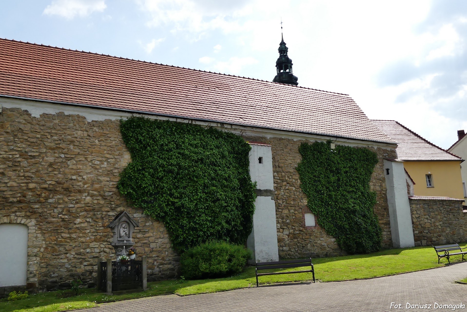 Kościół jest budowlą wzniesioną z kamienia i cegły, posiada dwie nawy, siedem przęseł i czworoboczną wieżę, w górnej części przechodzącej w ośmiobok, zwieńczoną wysokim hełmem z trzema prześwitami. Bryła jest nakryta dwoma dachami dwuspadowymi. Świątynia posiada dwa prezbiteria, dwie kruchty i zakrystię. Wnętrze przykryte jest sklepieniem krzyżowo-żebrowym. W kościele zachowało się sporo kamiennych detali architektonicznych pochodzących z XIII i XIV wieku. Najstarszym zachowanym zabytkiem jest rzeźba Matki Boskiej z Dzieciątkiem, umieszczona na głównym ołtarzu. Figura pochodzi z XV wieku. Z 1577 roku pochodzi wykuta z piaskowca chrzcielnica. Poza tym zachowały się: barokowa krata z XVII wieku, neogotycka ambona z 1874 roku, prospekt organowy z 1753 roku, w prezbiterium rzeźby św. Franciszka Ksawerego i św. Jana Nepomucena. Ponadto rzeźba Chrystusa Frasobliwego z 1740 roku, a w kruchcie renesansowe epitafium Koschwitzów z I połowy XVI wieku.