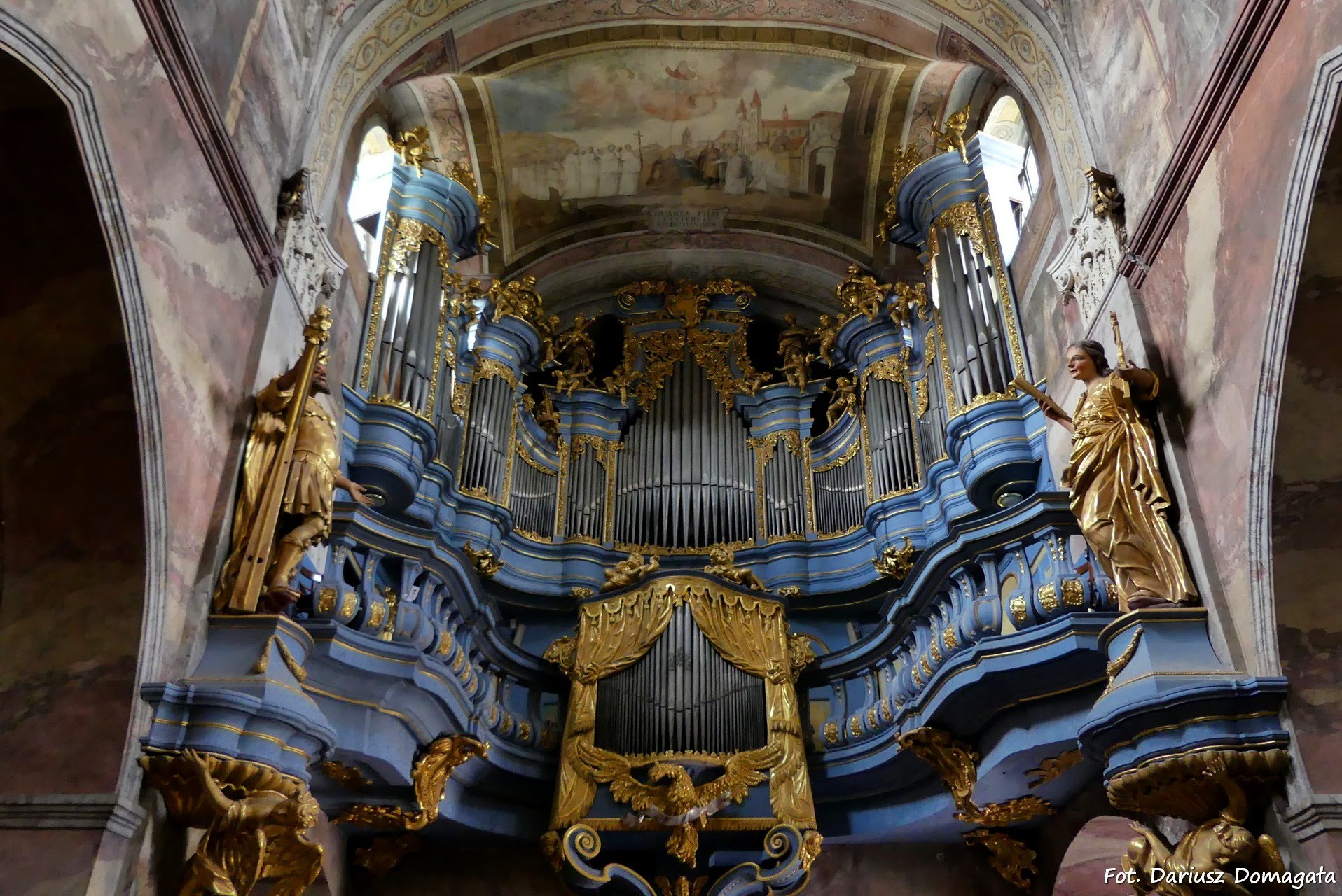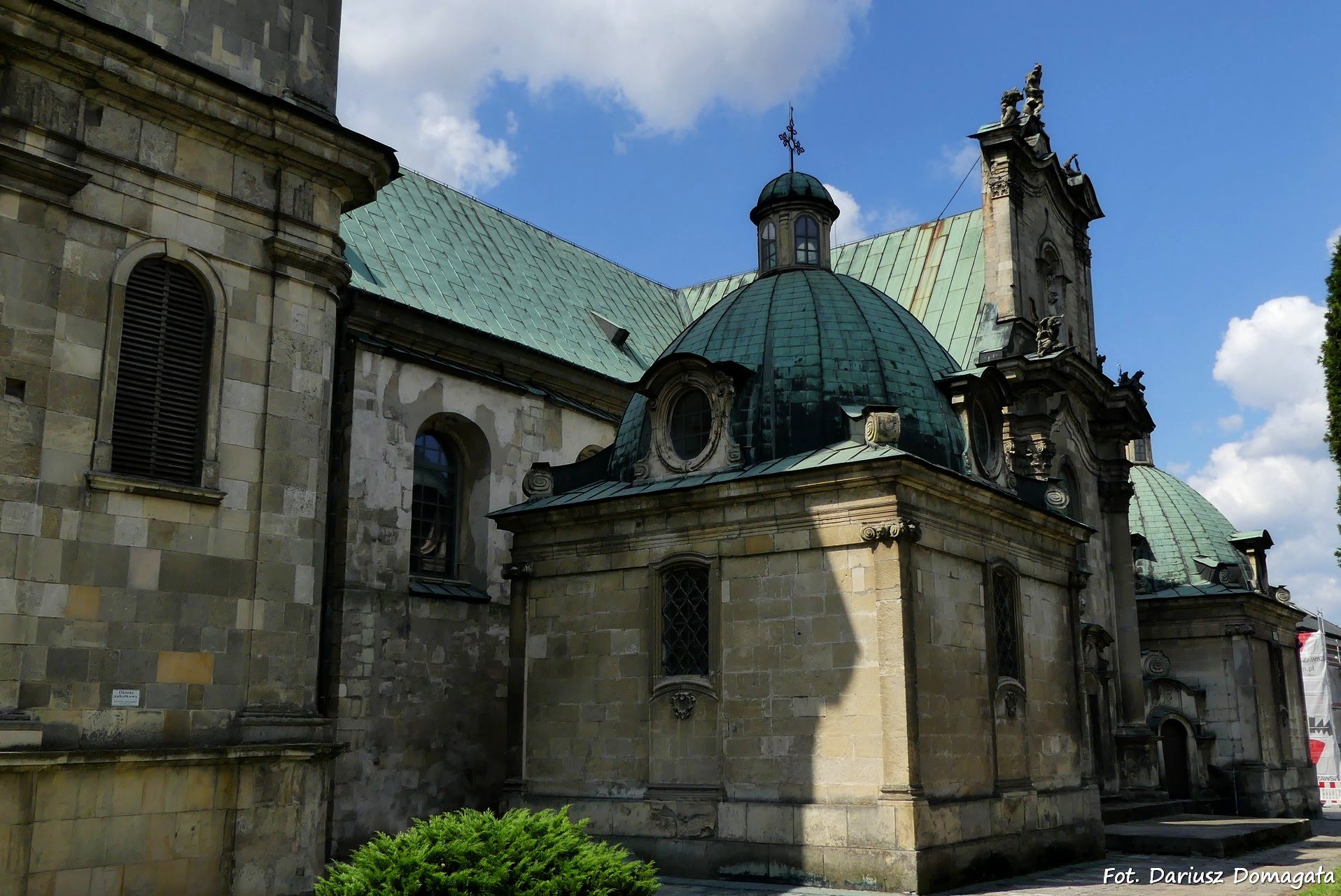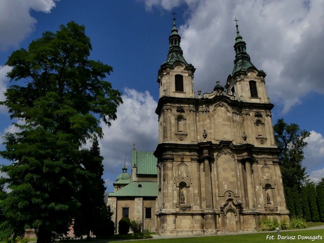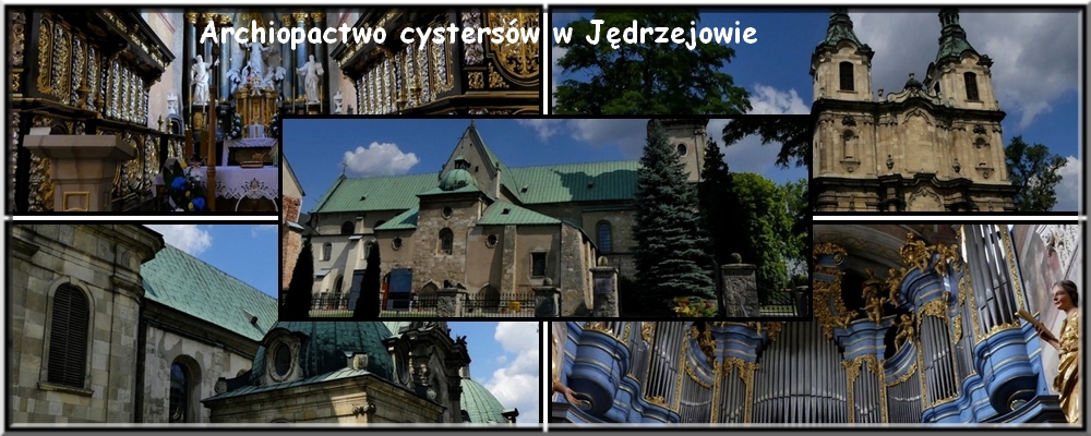 Cystersi zbudowali klasztor (fot.) (fot.) i kościół klasztorny pod wezwaniem Wniebowzięcia NMP oraz św. Wojciecha. Kościół został konsekrowany w 1210 roku za sprawą biskupa krakowskiego Wincentego Kadłubka. Osiem lat później Wincenty Kadłubek, za zgodą papieża, porzucił biskupstwo i wstąpił do jędrzejowskiego klasztoru, gdzie spędził ostatnia lata swojego życia (1218-1223) (fot.). Został pochowany w osobnej kaplicy w północnej nawie kościoła. Opactwo rozwijało się prężnie i wkrótce utworzono filie w Ludźmierzu na Podhalu (1235) i w Rudach (1252). Klasztor był nie tylko ważnym ośrodkiem życia religijnego i kulturalnego, ale zakonnicy opiekowali się również miejscową ludnością w sferze medycznej zakładając hospicjum i szpital. Zakonnicy zajmowali się także hodowlą ryb, a klasztor posiadał młyny, tartak, hutę szkła. Na terenie opactwa znajdował się także zakład budowy organów. Dzięki rozległej działalności zakonników, mała wówczas osada, otrzymała w 1271 roku prawa miejskie od Bolesława Wstydliwego. W 1447 roku opatem został Mikołaj Odrowąż z Rembieszyc. Wytyczył on plan gruntownej przebudowy klasztoru oraz modernizacji kościoła klasztornego. W 1475 roku przebudowano klasztor z krużgankami, wprowadzono gotyk do romańskiego kościoła, zbudowano odrębny budynek opatówki z hospicjum. Do prac artystycznych w opactwie zaproszono m.in. Wita Stwosza i krakowskich złotników: Mikołaja Kreglera i Mikołaja Breimera. W miejsce zniszczonego kościółka parafialnego z XII wieku zbudowano w 1479 roku nowy, gotycki kościół (dziś św. Trójcy). Rozkwit opactwa zakończył się w momencie wprowadzenia urzędu opata komendatoryjnego, który nie był wybierany przez mnichów, ale narzucany przez władze świeckie. Do ruiny gospodarczej klasztoru przyczynił się także najazd Szwedów, podczas którego opactwo zostało ograbione. Opactwo trawiły również pożary: w 1726 i 1800 roku. Zwłaszcza drugi pożar okazał się tragiczny w skutkach. Spłonęły bowiem archiwum i biblioteka, w której spoczywał m.in. list św. Bernarda do cystersów jędrzejowskich, a także oryginał "Kroniki Polaków" Wincentego Kadłubka. Po tych wydarzeniach opactwo nie wróciło już do swojej świetności. Kolejny cios nadszedł w 1819 roku, kiedy to car Aleksander I dokonał kasaty zakonu. Mnisi mogli co prawda zostać w murach klasztornych, ale zabroniono im przyjmować kandydatów na zakonników, więc z biegiem czasu wspólnota wymarła. Ostatni z zakonników, o. Wilhelm Ulawski, zmarł w 1855 roku. Przez pewien czas klasztorem opiekowali się franciszkanie reformaci. Niestety, za pomoc uczestnikom Powstania Styczniowego zostali oni usunięci z Jędrzejowa. W klasztorze utworzono wówczas rosyjskie, męskie seminarium nauczycielskie. Pod koniec XIX wieku udało się w dawnym opactwie powołać do życia filię kościoła Trójcy Świętej. W 1913 roku, dzięki biskupowi kieleckiemu Augustynowi Łosińskiemu, utworzono samodzielną parafię, którą prowadził kler diecezjalny. Cystersi powrócili do klasztoru w Jędrzejowie po II wojnie światowej dzięki staraniom biskupa Czesława Kaczmarka. Początkowo utworzono tu przeorat zależny podległy Szczyrzycowi, następnie w 1953 roku przeorat samoistny, aż w końcu w 1989 roku podniesiono klasztor do rangi opactwa. Obecnie wspólnota liczy kilkunastu mnichów, zaś na jej czele stoi o. opat Rafał Ścibiorowski. Opactwo można zwiedzić, ale jedynie w grupach zorganizowanych. Kościół klasztorny, konsekrowany w 1210 roku, przez kilka wieków pozostawał w tym samym kształcie. Dopiero w XVII wieku zbudowano prostokątną zakrystię, dostawioną do południowej ściany prezbiterium. Po pożarze w 1726 roku kościół odbudowano w stylu barokowym. Podczas odbudowy w latach 1728-1730 przedłużono ku wschodowi prezbiterium, a potem, w latach 1751-1754, dwuwieżową "ślepą" fasadę z dwiema, charakterystycznymi symetrycznymi wieżami. Od strony północnej zbudowano w latach 1733-1742 dwie symetryczne (względem osi transeptu) kwadratowe, barokowe kaplice: Niepokalanego Poczęcia NMP od wschodu i bł. Wincentego Kadłubka od zachodu. Kaplica Niepokalanego Poczęcia NMP połączona jest skośnym przejściem z kaplicami bliźnimi przy transepcie, a kaplica bł. Kadłubka otwarta jest arkadą do północnej nawy kościoła. Kaplice nakrywają kopuły wsparte na żagielkach i zwieńczone latarniami. W ramach odbudowy wykonane zostały też nowe sklepienia. Obecnie kościół złożony jest z bazylikowego korpusu trójnawowego, czteroprzęsłowego, z transeptem i pierwotnie dwuprzęsłowego prezbiterium, zamkniętego półkoliście. W narożnikach przy prezbiterium i ramionach transeptu mieszczą się bliźnie kaplice. Po obu bokach północnego ramienia transeptu, dostawione zostały dwie symetryczne kaplice kopułowe (fot.). Od wschodu do prezbiterium dostawiona jest reprezentacyjna ślepa fasada, lekko wypukła w części środkowej, ujętej w dwie czworoboczne wieże, nakryte barokowymi hełmami z latarniami (fot.) (fot.). Fasada rozczłonkowana jest podziałami kolumnowymi i pilastrowymi, posiada wyłamujące się gzymsy i bogatą dekorację rzeźbiarską. Kościół nakryty jest dachami dwuspadowymi nad prezbiterium, nawą główną i ramionami transeptu. Na ścianach i sklepieniach zachowała się późnobarokowa polichromia wykonana w latach 1734-39 przez Andrzeja Radwańskiego (fot.) (fot.). Przestawia ona sceny z życia świętych i historii zakonu cystersów, zaś nad skrzyżowaniem naw widnieją Chrystus i Maria na tle iluzjonistycznej architektury. Wyposażenie wnętrza pochodzi przeważnie z lat 1730-50. W prezbiterium znajduje się ołtarz główny z 1731 roku, wypełniony rzeźbami z grupy Wniebowzięcia NMP oraz ze srebrnym tabernakulum wykonanym około 1766 roku w Augsburgu (fot.) (fot.). Po obu stronach prezbiterium ustawione są stalle o bogatej dekoracji snycerskiej (fot.)