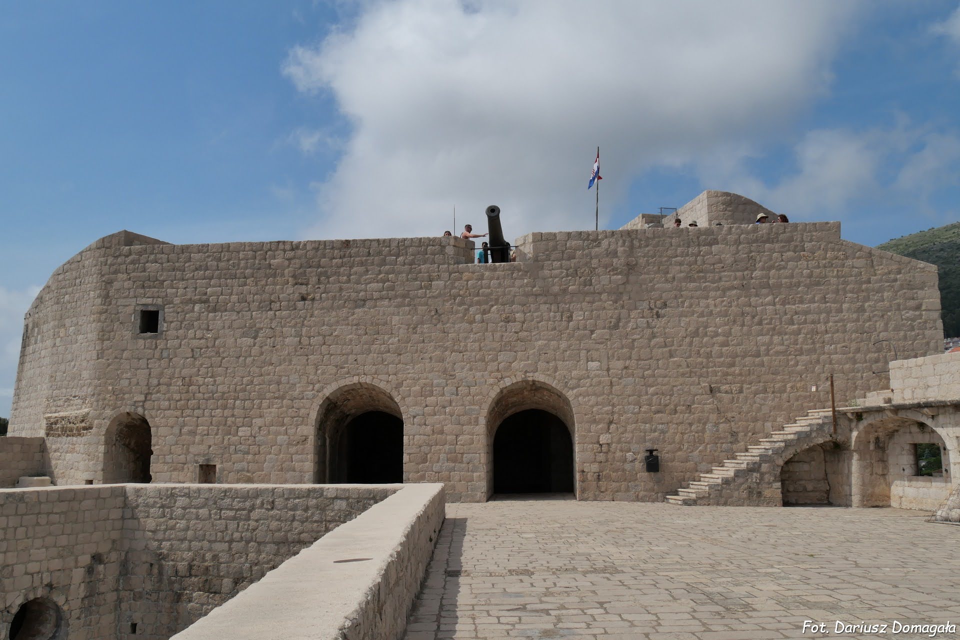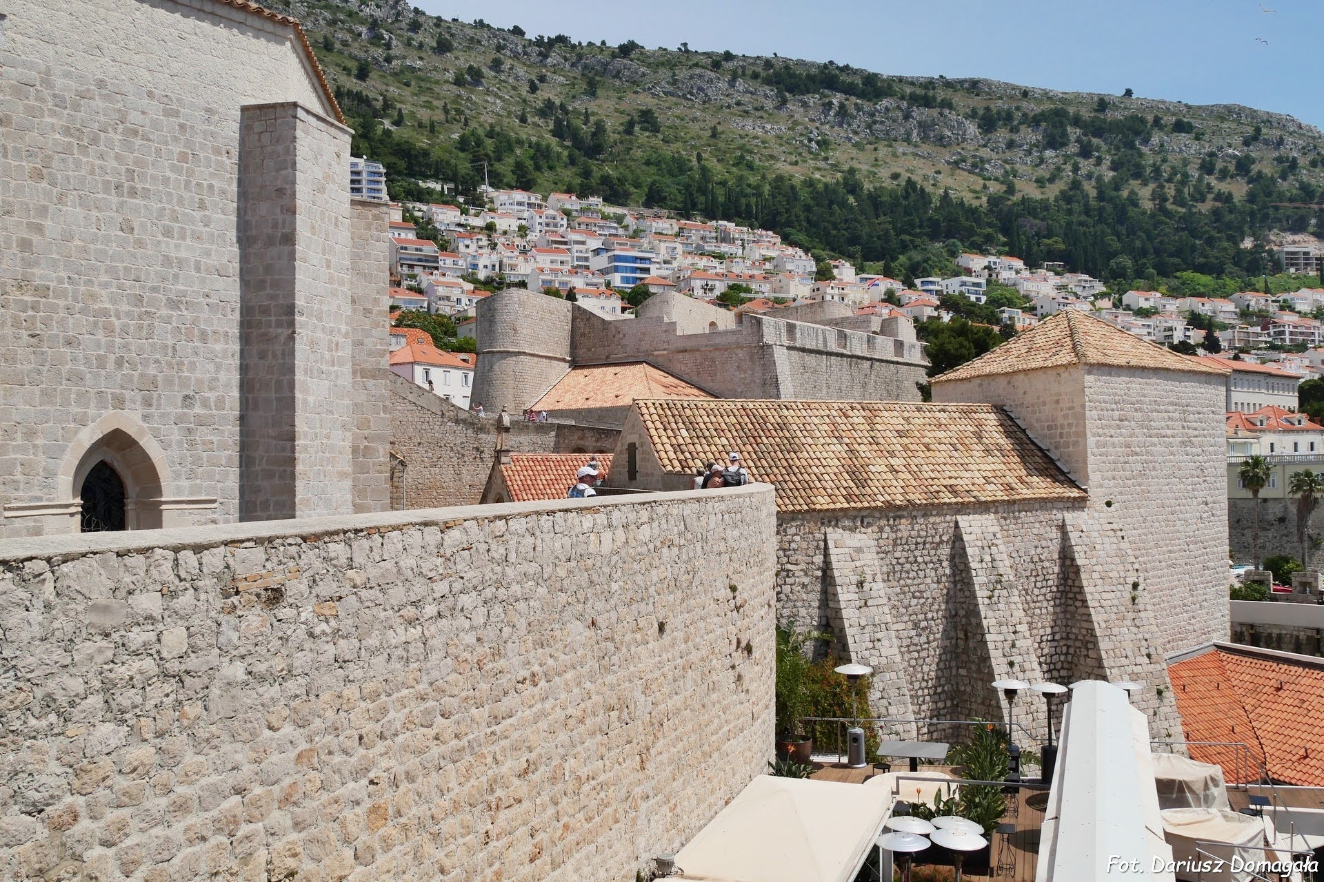 W ich ciągu znajdują się baszty i bramy: baszta Minčeta (fot.), baszta Asimon, baszta św. Łukasza, baszta św. Jana, baszta św. Zbawiciela, baszta św. Stefana, baszta św. Małgorzaty, baszta św. Piotra, baszta Bokar (fot.), baszta Puncjela, brama Pile (fot.) (fot.), brama Buže, brama Ploče, brama Peskarija, brama Ponte. Wejście na mury Dubrownika jest możliwe w trzech miejsach i jest płatne i raczej drogie. W 2025 roku bilet wstępu dla osoby dorosłej kosztował 40 euro. Warto kupić bilety przez internet, co pozwala ominąć kolejkę do kasy. Najlepiej zrobić to na oficjalnej stronie: https://shop.citywallsdubrovnik.hr/en. Główne wejście na mury (i najbardziej oblegane) jest przy bramie Pile. Przejście przez mury trwa około 2 godzin i odbywa się w jednym kierunku. Podczas wędrówki możemy być poproszeni ponownie o pokazanie biletów. Nie jest możliwe zejście z murów i ponowne wejście. Mimo wysokiej ceny nie sposób ominąć wyprawę na mury podczas zwiedzania Dubrownika. Widok z murów na miasto, mimo sporych tłumów turystów, wart jest każdej ceny: (fot.) (fot.) (fot.) (fot.) (fot.).