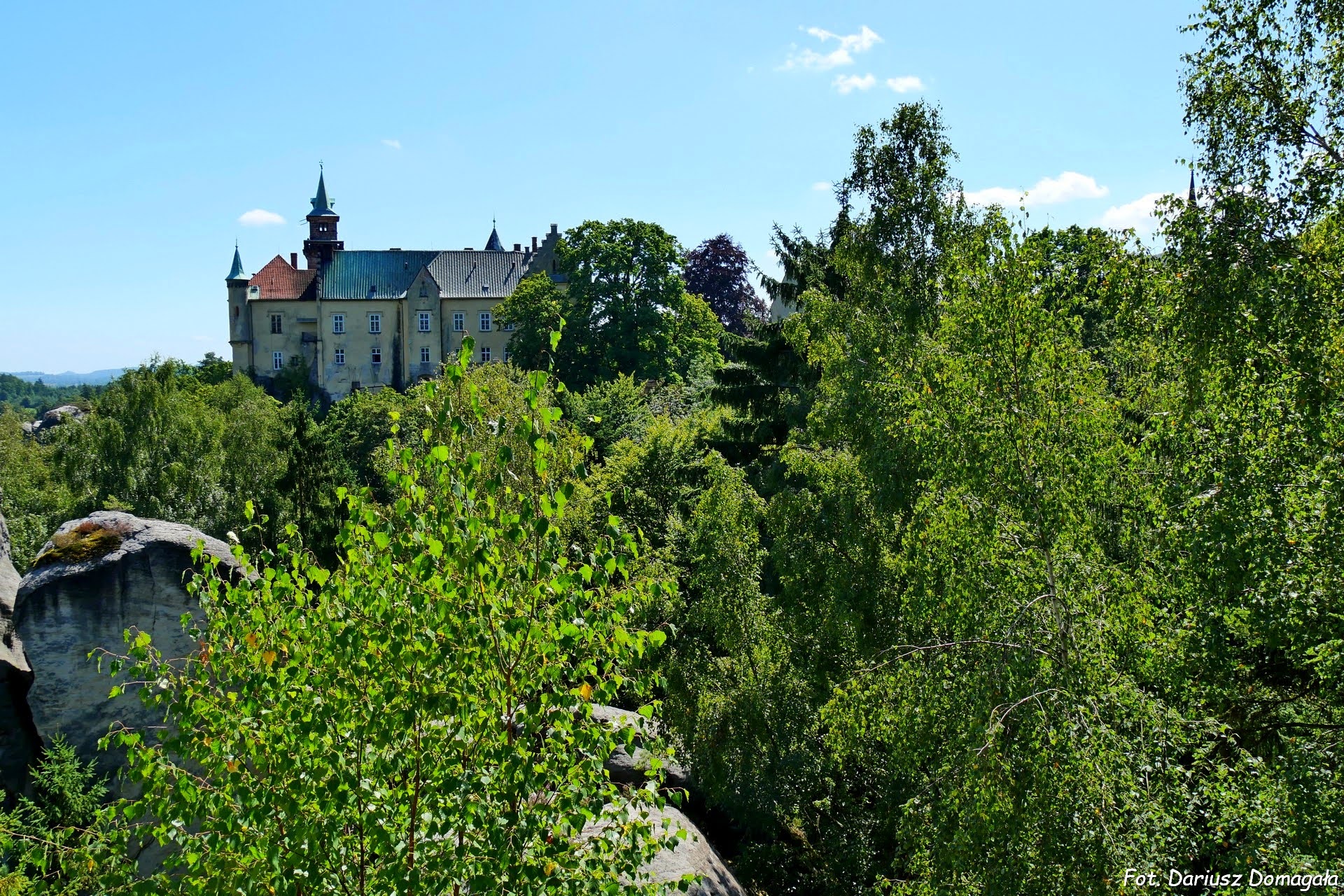 Idąc dalej w kierunku zamku Hrubá Skála przejdziemy przez Arboretum Bukovina założone w 1860 roku (fot.). Na powierzchni około 3 hektarów mamy m.in. gatunki północnoamerykańskich drzew. Dochodząc do skrzyżowania czerwonego, niebieskiego i żółtego szlaku można, a nawet trzeba, skręcić ze szlaku czerwonego, który prowadzi wprost do zamku. Wybieramy szlak niebieski, który również poprowadzi nas do zamku Hrubá Skála, ale poprzez miejsca zwane Adamowym Łożem (Adamovo lože) i Mysią Dziurą (Myší díra). Adamowe Łoże to skała przypominająca łóżko (łoże) wyrzeźbiona na polecenie Adama Františka (fot.). Miała upamiętniać postacie 3 Adamów: Adama, pierwszego człowieka, Adama z Valdštejna, założyciela rodu i autora pomysłu Adama Františka. Mysia Dziura z kolei to wąska skalna szczelina (fot.). Ten odcinek szlaku jest bardzo urozmaicony, pełno tu szczelin, kamiennych schodów i skał o ciekawych kształtach. To chyba najbardziej malowniczy i tajemniczy fragment szlaku :-) (fot.) (fot.) (fot.) Za chwilę dochodzimy do zamku Hrubá Skála, a szlak dość nieoczekiwanie wyprowadza nas na zamkowy parking.