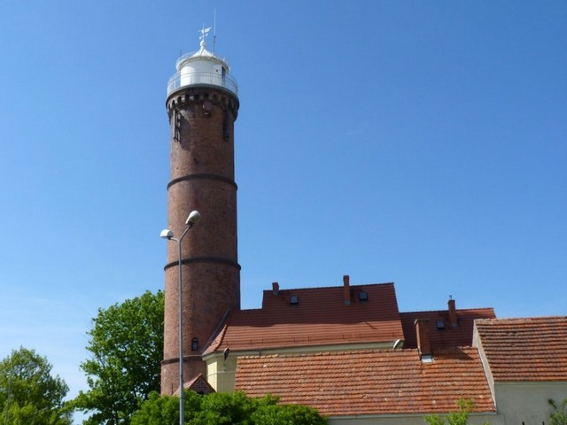 Wysokość wieży: 64,8 m Wysokość światła: 68 m n.p.m. Zasięg światła: białe 24 Mm (około 46,3 km), czerwone 9Mm (około 16,6 km) Charakterystyka światła: przerywane, okres - 5 s (światło - 4 s, przerwa - 1 s) Położona w dzielnicy Warszów miasta Świnoujście na wyspie Wolin po wschodniej stronie rzeki Świny (fot.). Administrowana przez Urząd Morski w Szczecinie. To najwyższa latarnia morska na polskim wybrzeżu Bałtyku i jedna z najwyższych na świecie. Jest to także najwyższa na świecie latarnia wykonana z cegły. Kompleks latarni składa się z trzech części - wieża latarni jest zbudowana z ceramicznej cegły (fot.), a od strony północnej i południowej przylegają do niej dwukondygnacyjne budynki z czerwonej cegły, w których mieściły się urządzenia radiolatarni oraz pomieszczenia dla obsługi. Wieża zakończona jest metalową laterną. Latarnia posiada sektor biały i czerwony - światło koloru czerwonego widoczne jest od strony Świny. Jako źródło światła zainstalowany jest aparat 4Fresnela I klasy. Dwupozycyjny zmieniacz zawiera dwie żarówki, każda po 4200 W. Budowę obecnej latarni rozpoczęto w 1854 roku, a po trzech latach, 1 grudnia 1857 roku latarnia została uruchomiona. Do 1902 roku wieża latarni, od dolnej galerii do galerii górnej, miała kształt ośmioboku zwężającego się ku górze i była zbudowana z żółtej licowanej cegły. Początkowo latarnia świeciła światłem stałym, a źródłem światła była lampa Arganda zasilana olejem rzepakowym. W 1862 roku wprowadzono zasilanie olejem mineralnym. Z powodu znacznych zniszczeń cegły spowodowanych trudnymi warunkami atmosferycznymi, w latach 1902-1903 przeprowadzono kapitalny remont wieży zmieniając przy okazji jej kształt z ośmiokątnego na okrągły. Zmodernizowano wówczas źródło światła instalując palnik naftowy, a w 1905 roku wprowadzono obowiązującą do dziś charakterystykę światła. W 1921 roku zainstalowano elekryczność i żarówkę o mocy 3000 W. Od 1947 roku latarnia pełniła rolę radiolatarni, która została wyłączona w listopadzie 1999 roku. W latach 1998-2000 przeprowadzono remont, który objął wieżę wraz z przylegającymi do niej budynkami. Latarnia jest udostępniona do zwiedzania od sierpnia 2000 roku. W jednym z przylegających do latarni budynków mieści się Muzeum Latarnictwa i Ratownictwa Morskiego. Wstęp płatny. Panorama z latarni - klik, klik