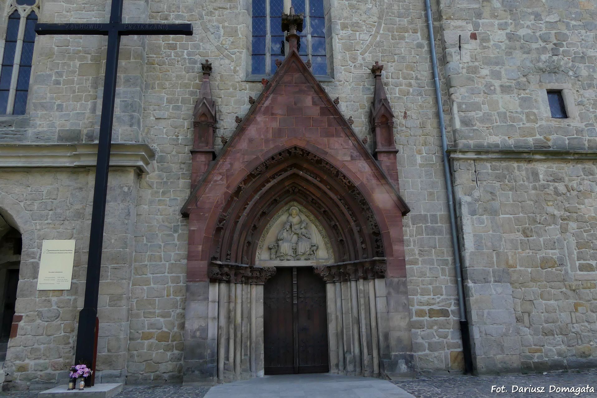 Obecnie jest to świątynia murowana z cegły i ciosów piaskowcowych, halowa o trzech nawach i ośmiu przęsłach, składająca się z prezbiterium i naw bocznych. Fasada zachodnia z dwiema wieżami jest ozdobiona na osi portalem z końca XIII wieku, wykonanym z czerwonego piaskowca. W tympanonie jest umieszczona płaskorzeźba przedstawiająca Koronację Matki Boskiej (fot.). Wewnątrz kamienna, renesansowa chrzcielnica z około 1560 roku, barokowy obraz Koronacja Matki Boskiej z 1771 roku, w zakrystii znajduje się puszka z 1684 roku, pacyfikał z 1722 roku i kielich z 1727 roku (fot.) (fot.).