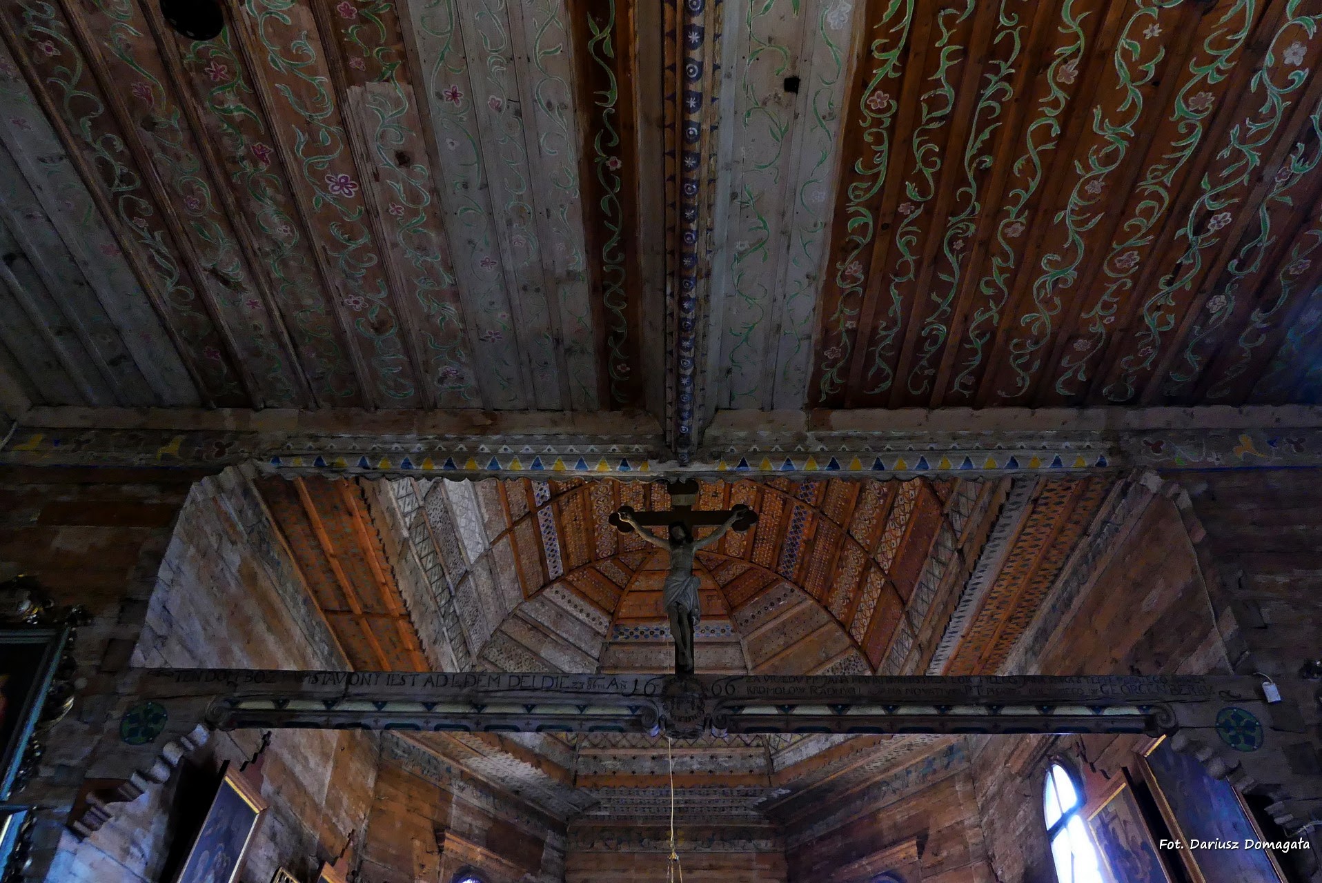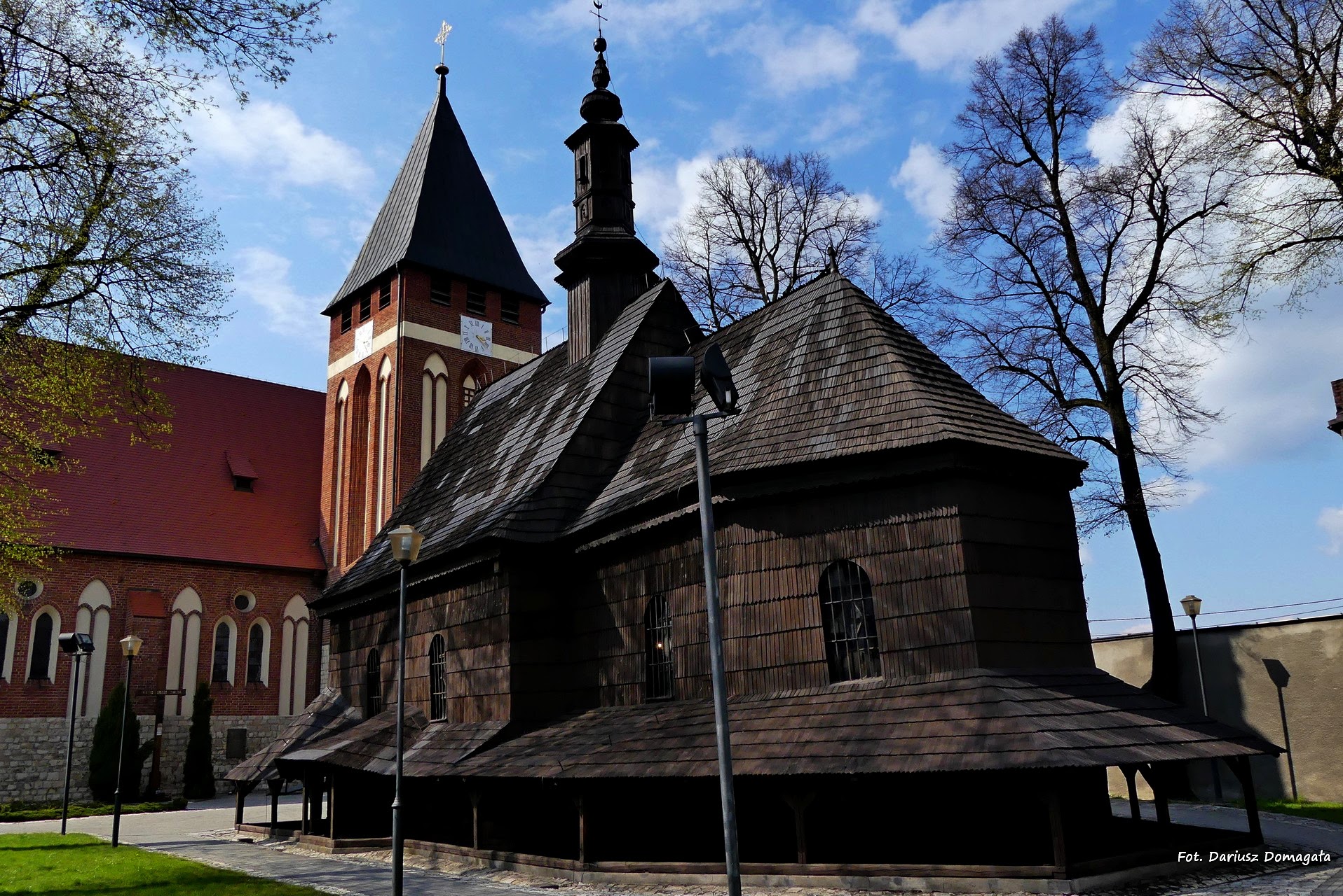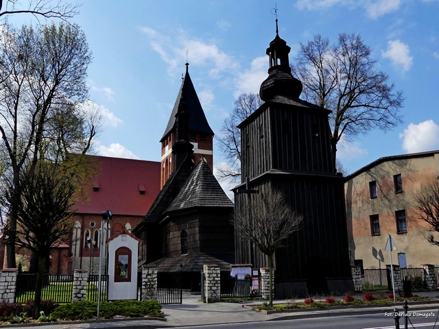 Kościół jest drewniany, orientowany, wybudowany w konstrukcji zrębowej, na podmurówce z kamienia (fot.) (fot.) (fot.). Nawa kościoła na rzucie zbliżonym do kwadratu, prezbiterium węższe, wydłużone, zamknięte trójbocznie. Od północnej strony prezbiterium znajduje się prostokątna zakrystia. Od zachodu do nawy dostawiona jest niewielka kruchta. Od zewnątrz kościół otoczony jest otwartymi sobotami wspartymi na słupach z zastrzałami (fot.). Dachy gontowe, dwuspadowe, nad prezbiterium wielospadowy, nad zakrystią pulpitowy. W dachu nad nawą znajduje się wieżyczka na sygnaturkę z latarnią i gontowym hełmem. Prezbiterium nakryte pozornym sklepieniem kolebkowym, nawa płaskim stropem na krzyżujących się podciągach. Wyposażenie wnętrza w dużej części barokowe (niektóre elementy zostały przeniesione do nowego kościoła). Z XVII wieku pochodzą m.in. obraz Wniebowzięcia Matki Bożej we współczesnej ramie w ołtarzu głównym (fot.). Oprócz tego wizerunki św. św. Piotra i Pawła na malowanej, drewnianej tablicy (predelli) z 1600 roku. Do nowej świątyni przeniesiono m.in. cudowny obraz Matki Bożej Bolesnej z 1669 roku. Chór muzyczny, z lewej strony przedłużony na ścianę, wsparty jest na jedenastu słupach. Organy wykonane w połowie XIX wieku (fot.). Belka tęczowa wsparta na ozdobnych wspornikach, na niej wyryty jest rok budowy kościoła i nazwiska fundatorów. Na środku belki umieszczony jest krucyfiks (fot.). Na stropach prezbiterium i nawy zachowały się słabo widoczne fragmenty polichromii. Zachowały się także zacheuszki, czyli pomalowane na belkach miejsca pomazania świętymi olejami podczas konsekracji w 1670 roku. Dzwonnica wybudowana na rzucie kwadratu, drewniana, konstrukcji słupowej (fot.). Dach gontowy, namiotowy. Przy kościele znajduje się murowany, neogotycki kościół parafialny Wniebowzięcia NMP wybudowany w latach 1905-1908. Kościół Wniebowzięcia Najświętszej Marii Panny i św. Jerzego w Miasteczku Śląskim znajduje się na Szlaku Architektury Drewnianej województwa śląskiego. Wstęp bezpłatny, niestety kościół najczęściej bywa zamknięty. Nam się udało, bowiem w kościele akurat kończyła się msza św. i po jej zakończeniu mogliśmy obejrzeć wnętrze :-) Kościół znajduje się w miejscowości Miasteczko Śląskie (powiat tarnogórski, województwo śląskie). Miasto leży historycznie na Górnym Śląsku. Przez Miasteczko Śląskie przebiegają drogi wojewódzkie nr 912 i 908. Miejscowość położona jest w odległości około 32 km na północ od Katowic. Według danych z roku 2016 miasto liczyło około 7300 mieszkańców. 10.2017 Na podstawie stron internetowych: Kościół w Miasteczku Śl. w Wikipedii, Parafia Wniebowzięcia NMP w Miasteczku Śląskim oraz www.slaskie.travel - kościół w Miasteczku Śl.. Aktualizacja 15.10.2017 |