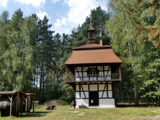 typowy dla regionu pogranicza wielkopolsko-lubuskiego typ drewnianego budownictwa zrębowego.