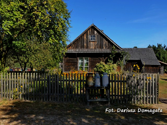 budowlaną z wygodą i niskimi kosztami budowy. W skład zagrody wchodzi dom, stodoła i chlewik. Budynki drewniane. Chałupa
