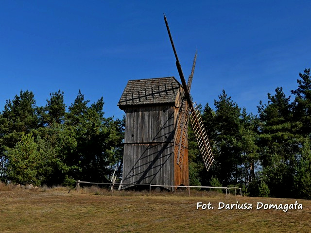 Z lat 90-tych XIX wieku z Krajny. Wiatrak z obrotowym dachem, czterokondygnacyjny. Konstrukcja drewniana posadowiona na