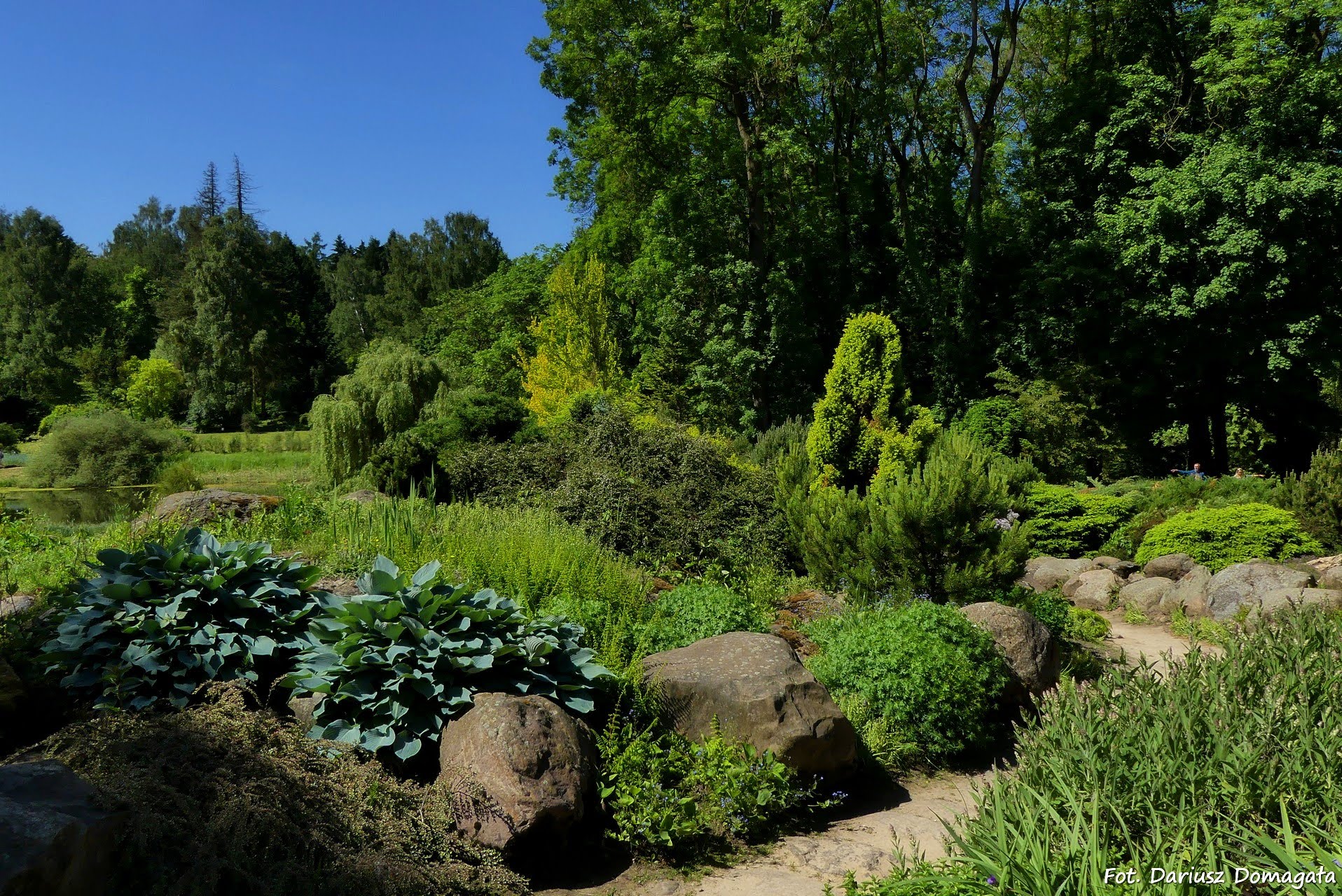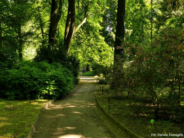 można zobaczyć różaneczniki i azalie. W prawo odchodzi Ścieżka Różaneczników z kolekcją różaneczników i azali. Dalej w
