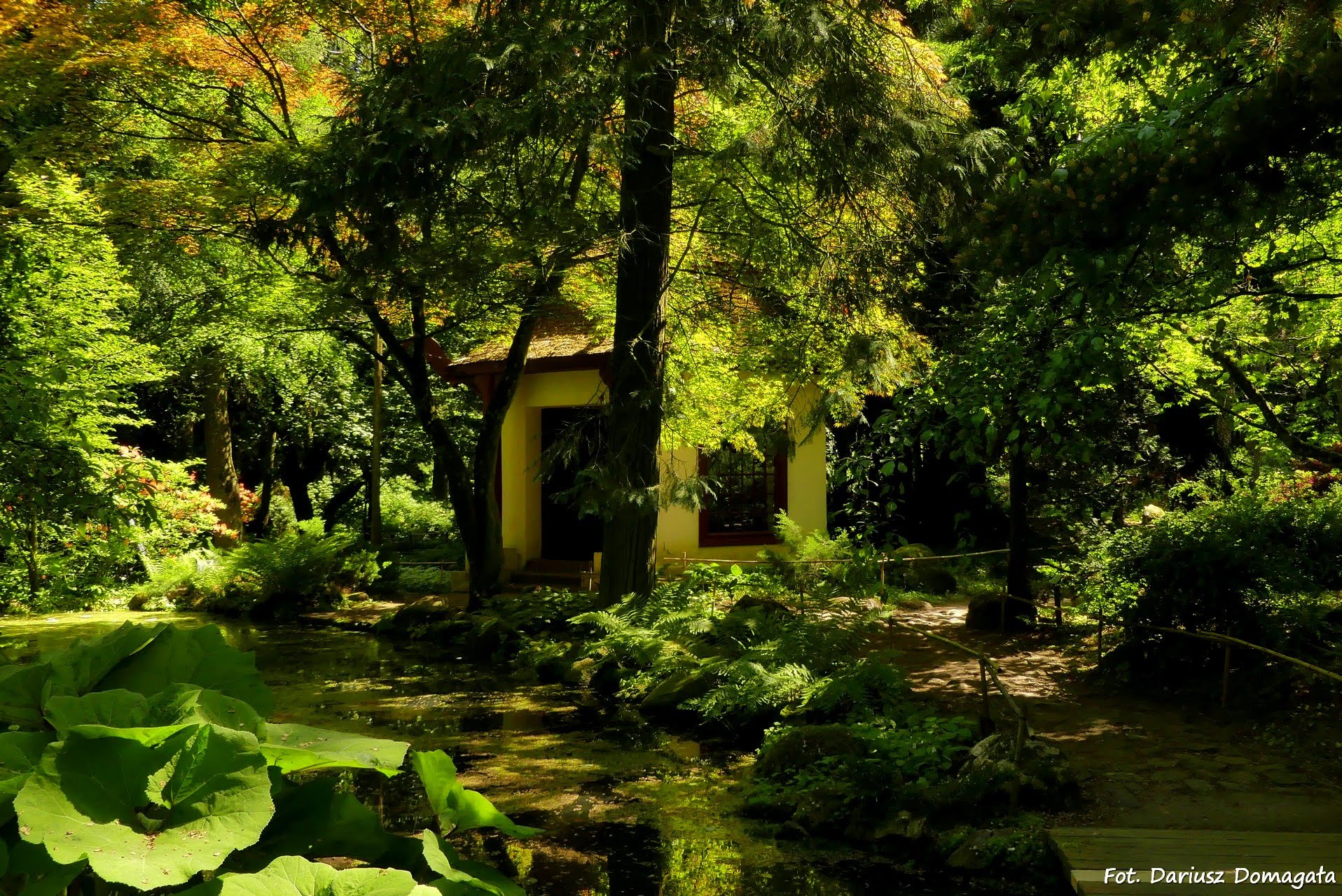 Z głazami, pawilonem herbacianym i sadzawką z drewnianym mostkiem, obsadzony roślinami ze