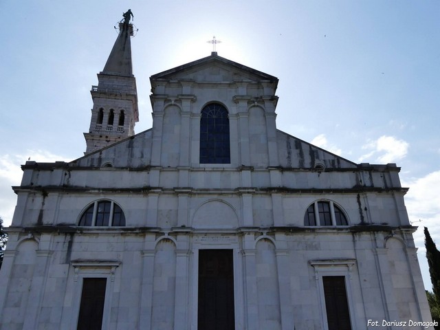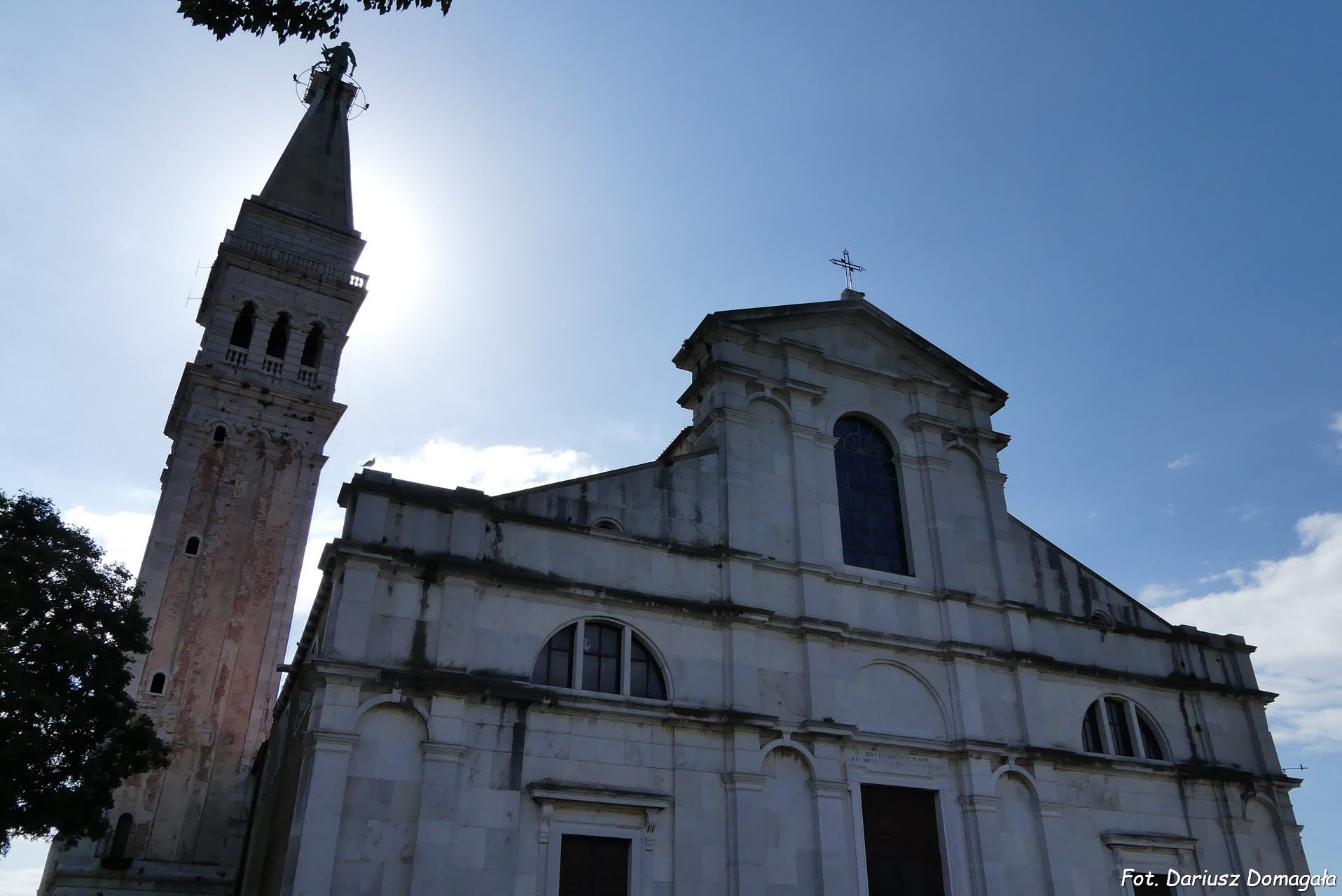 Kościół św. Eufemii reprezentuje typ baroku weneckiego. Jego długość wynosi 51 m, a szerokość 30 m. Nawa główna ma 17 m wysokości, a nawy boczne 10 m. Obok kościoła znajduje się dzwonnica, której budowa rozpoczęła się w 1654 roku (fot.). W 1687 roku dzwonnicę zwieńczono hełmem. Na jej szczycie znajduje się miedziany, pozłacany posąg św. Eufemii, umieszczony na łożyskach, aby mógł obracać się wokół własnej osi w zależności od kierunku wiatru. Dzwonnica wraz z posągiem ma 62 m wysokości i jest najwyższą wieżą kościelną na Istrii. W ołtarzu głównym znajdują się posągi św. Jerzego, św. Marka i św. Rocha, zbudowane z marmuru karraryjskiego (fot.). Po lewej stronie ołtarza głównego znajduje się marmurowy ołtarz Najświętszego Sakramentu (fot.), a po prawej, również marmurowy, ołtarz św. Eufemii z Chalcedonu, patronki miasta (fot.). Za ołtarzem znajduje się sarkofag, w którym przechowywane są relikwie św. Eufemii (fot.). Sarkofag wykonany z marmuru, jest datowany na III wiek, a do Rovinja dotarł około 800 roku. Miejska legenda głosi, że sarkofag sam wypłynął u wybrzeży miasta. Na ścianach otaczających sarkofag wiszą obrazy z 1883 roku, przedstawiające dotarcie sarkofagu do wybrzeży Rovinja oraz męczeństwo św. Eufemii (fot.). Na sklepieniu znajduje się obraz przedstawiający koronację św. Eufemii na niebie (fot.). Katedrę można zwiedzać, ale jest ona otwarta dla turystów mniej więcej od godziny 10. Samo wejście jest bezpłatne, zapłacić trzeba tylko za wejście na taras widokowy na dzwonnicy. Warto jednak wydać kilka euro bowiem widok z góry jest zachwycający. Panorama obejmuje oczywiście miasto i Adriatyk z archipelagiem 13 wysepek (fot.) (fot.).
