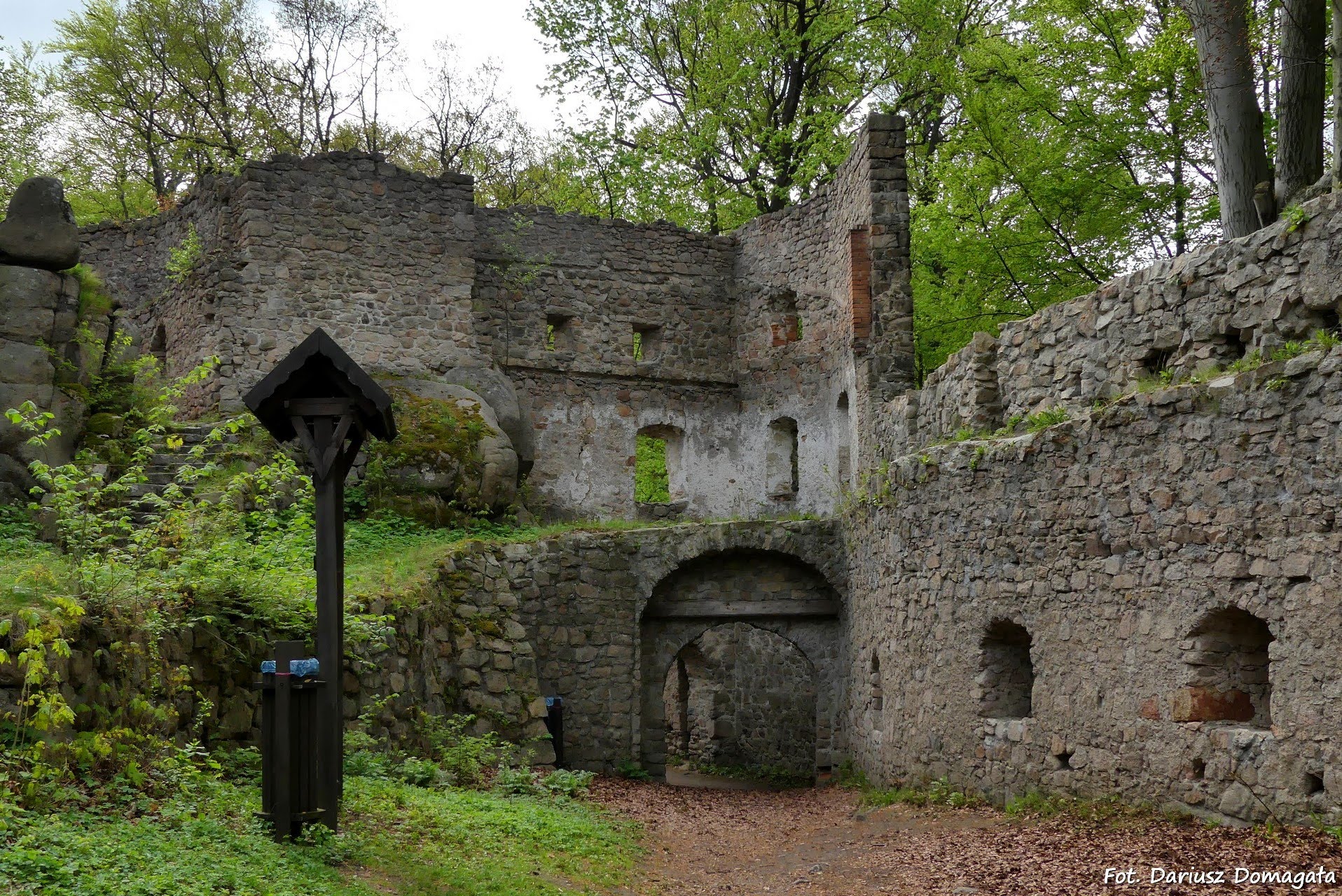 W 1822 roku księżna Maria Anna Amalie von Hessen-Homburg i jej mąż książę Wilhelm Hohenzollern utworzyli na tym terenie romantyczny park krajobrazowy. Wykonano wówczas liczne ścieżki spacerowe, a w skałach wykuto schody i zabezpieczono punkt widokowy poręczą. Na cześć żony księcia Wilhelma miejsce to nazwano nazywano Mariannenfels, czyli Skała Marianny. Na skale została umieszczona nazwa z miedzianych liter, których ślad widoczny jest do dzisiaj. Najwyższą skałę zdobił żeliwny lew, który przetrwał do lat 70-tych XX wieku. Z platformy widokowej rozpościera się rozległa panorama Karkonoszy, Gór Izerskich, Gór Kaczawskich i Rudaw Janowickich. Wycieczkę rozpoczynamy w Janowicach Wielkich na ulicy Robotniczej. Samochodem można dojechać pod sam szlaban zagradzający wjazd na teren leśnej drogi. Z tego miejsca wyruszamy szlakiem żółtym wygodną, szeroką drogą. Po prawej stronie drogi towarzyszy nam strumyk o nazwie Janówka (fot.). Po kilkunastu minutach dochodzimy do Rozdroża pod zamkiem Bolczów w pobliżu skał zwanych Krowiarki. Tu skręcamy z drogi na leśny odcinek szlaku o kolorze zielonym. Teraz mamy do pokonania malowniczy odcinek pod górę aż do ruin zamku Bolczów (fot.) (fot.) (fot.). Po drodze mijamy wiele malowniczych skalnych formacji. Wkrótce dochodzimy do pięknych ruin zamku Bolczów, o którym więcej możecie przeczytać na mojej stronie tutaj. Wchodzimy na teren zamku, na którego zwiedzanie należy zarezerwować sporo czasu, bowiem ruiny, niepozorne na pierwszy rzut oka, okazują się bardzo rozległe. Z części zamku zwanego Kapelanią mamy piękny widok na charakterystyczne wierzchołki Sokolika i Krzyżnej Góry, przez niektórych zwanych "cyckami Bardotki" ;-) (fot.) Po obejrzeniu zamku Bolczów wracamy na szlak i idziemy za kolorami czarnymi w kierunku Głazisk Janowickich. Po prawej stronie szlaku mijamy charakterystyczne skały zwane Skalnymi Bramami. Po osiągnięciu Głazisk Janowickich kierujemy się szlakiem niebieskim w kierunku Starościńskich Skał. Ścieżka prowadzi lasem i miejscami jest dość uciążliwa. Mijamy skrzyżowanie ze szlakiem żółtym i wkrótce dochodzimy do jednej z najbardziej znanych skał Rudaw Janowickich zwanej Skalnym Mostem (fot.) (fot.). Skała ma wysokośc ponad 20 m, a na dwóch turniach skalnych zawieszona jest kamienna kładka od której pochodzi nazwa formacji. Podobno Skalny Most charakteryzuje się zwiększonym promieniowaniem radioaktywnym. Tuż obok Skalnego Mostu leży skała o nazwie Piec, która też ma zwiększony poziom radiokatywności. Na Piec prowadzą skalne stopnie ubezpieczone barierką. Mamy stamtąd widok na Dolinę Janówki (fot.). Ten fragment szlaku prowadzi wygodną szeroką drogą. Wchodzimy teraz do lasu i zaczynamy podejście w kierunku Starościńskich Skał (fot.). Te niezwykle malownicze skały tworzące małe skalne miasteczko leżą na szczycie Lwiej Góry (718 m n.p.m.). Wiele ze skałek leżących na zboczach Lwiej Góry również posiada własne nazwy, m.in.: Ryjówka, Mrówcza Skała, Koń, Regał, Biblioteka, Żółw, Ślimak, Skośna czy Wielbłąd. Na Starościńskich Skałach utworzono punkt widokowy, z którego roztacza się piękna panorama Karkonoszy, Gór Izerskich, Gór Kaczawskich i Rudaw Janowickich (fot.) (fot.) (fot.). Na punkt prowadzą skalne stopnie, podobnie jak w innych miejscach, zabezpieczone barierkami. Ze Starościńskich Skał, w dalszym ciągu szlakiem niebieskim, kierujemy się w kierunku Rozdroża pod Lwią Górą, gdzie odchodzi żółty szlak do Strużnicy, a następnie do Rozdroża pod Jańską Górą. Tu wchodzimy na szlak zielony, a później również żółty i dochodzimy do skał Krowiarki, a następnie do miejsca, gdzie skęcaliśmy w kierunku zamku Bolczów. Stąd już tylko krok do Janowic Wielkich, do miejsca, gdzie zostawiliśmy samochód.