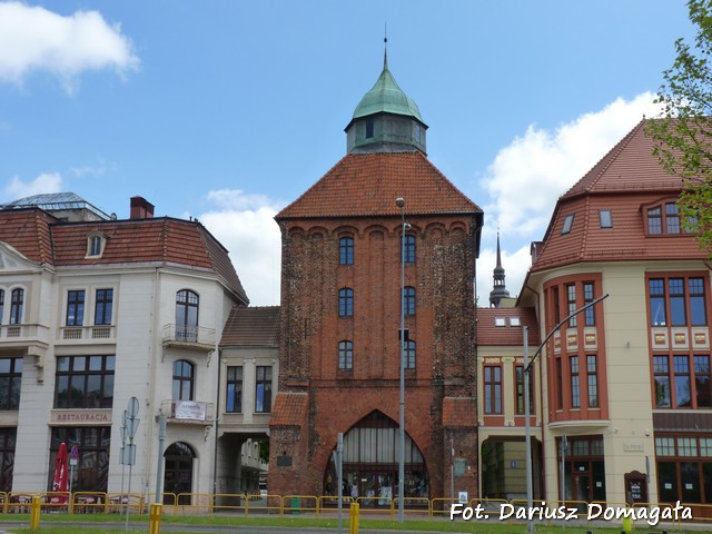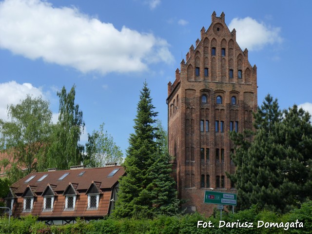 kondygnację z przejazdem, a w latach 1365-1370 dobudowano wyższe kondygnacje. Powstała z cegły na planie prostokąta. Brama jest