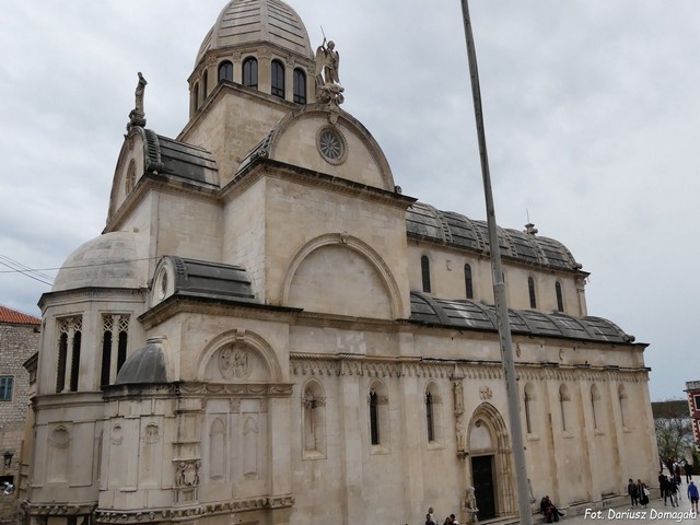 Budowla ma formę trójnawowej bazyliki z transeptem i wysoką ośmioboczną kopułą nad jego przecięciem z nawą główną. Fasada jest skierowana na północny zachód i jest podzielona pilastrami na trzy części. Pośrodku znajduje się bogato zdobiony portal główny (fot.). Obramowanie portalu stanowią nisze z figurami dwunastu apostołów. W szczycie znajduje się płaskorzeźba Chrystusa z uniesioną prawą ręką. Wewnętrzną część portalu wypełnia bogata ornamentyka roślinna. Po bokach ostrołukowe okna z niewielkimi maswerkami. Górna, renesansowa część fasady powyżej gzymsu, to prostokątne pole ujęte w dwa pilastry, z piękną rozetą pośrodku (fot.) oraz półokrągły tympanon z mniejszą rozetą. Portal boczny leżący od strony głównego placu jest jeszcze bardziej zdobiony od portalu głównego (fot.). Po obu jego stronach znajdują się figury lwów symbolizujących Wenecję, a z ich grzbietów wyrastają ośmioboczne kolumny, na których wspierają się rzeźby Adama i Ewy (fot.). Wyżej zostały umieszczono baldachimy z figurami św. Jakuba, patrona świątyni oraz św. Piotra Apostoła. Cała elewacja jest rytmicznie podzielona pilastrami, pomiędzy którymi znajdują się ostrołukowe okna. Od strony południowo wschodniej budowlę zamykają trzy absydy o renesansowych zdobieniach. Na absydzie od strony placu zwraca uwagę płaskorzeźba przedstawiająca św. Hieronima na pustyni. Na lewym pilastrze umieszczono dwa aniołki trzymające notatkę o budowie katedry (fot.). Najciekawsza dekoracja apsyd to znajdujący się niżej pas 71 rzeźb ludzkich głów, dla których wzorem były twarze mieszkańców Szybenika z czasów budowy tej części katedry (fot.) (fot.). Na półokrągłych szczytach prezbiterium i transeptu stoją figury św. Michała, św. Jakuba i św. Marka (fot.). We wnętrzu, w prezbiterium znajdują się renesansowe ławki dla kanoników i dwie ambony zawieszone na filarach transeptu. Ołtarz główny jest barokowy (fot.), a na lewo od niego stoi renesansowy tron biskupi. W większości barokowe są również ołtarze w nawach bocznych: w lewej nawie ołtarz Trzech Króli (jeszcze renesansowy), Matki Bożej z Karmelu (fot.) i Świętego Krzyża, w prawej nawie św. Rocha (neobarokowy), św. Krzysztofa oraz świętych Floriana i Sebastiana. Warto zwrócić uwagę na baptysterium umieszczone w absydzie nawy południowej. Jego renesansowe wnętrze nakrywa kopuła, a pośrodku stoi chrzcielnica, której misę wspierają figury aniołków (fot.). Katedra wyróżnia się również sposobem budowy. Otóż, cała budowla łącznie z dachem i pokryciem kopuły, jest zbudowana z kamienia. Jeszcze bardziej zadziwiający jest fakt, że podczas budowy nie używano zaprawy, a kamienie były przycinane w taki sposób, aby zazębiały się ze sobą. Do budowy używano wapienia z wyspy Brac, który po kilkudziesięciu latach sam się spaja. Na głównym placu obok katedry stoi pomnik Juraja Dalmatinaca, jednego z budowniczych kościoła (fot.). W 2000 roku katedra św. Jakuba została wpisana na Listę Światowego Dzidzictwa UNESCO. Zwiedzanie katedry jest płatne. Podczas naszej wizyty w Szybeniku we wnętrzu katedry prowadzono remont, więc niestety podziwianie katedry było zdecydowanie utrudnione. Dodatkowo jeszcze akurat trwała próba chóru - to się nazywa mieć pecha, bo cena biletu pozostała taka sama...