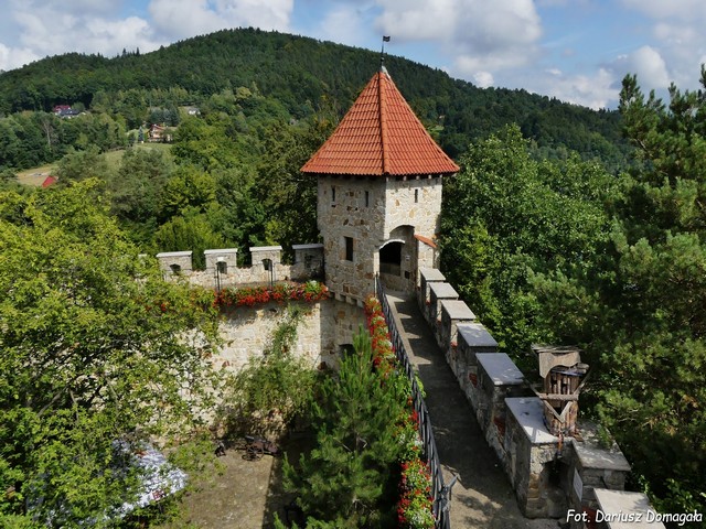 W XIV wieku zamek składał się z kamiennego muru obwodowego i drewnianej zabudowy wewnątrz. Na przełomie XIV i XV wieku od południa zbudowano gotycki budynek. Następnie powstała pięciokondygnacyjna wieża obronna od strony północno zachodniej. W XVI wieku od strony północnej powstał nowy reprezentacyjny budynek mieszkalny. W tym czasie powstała nowa brama od strony zachodniej. Pod koniec XIV wieku Tropsztyn jako posag przechodzi w ręce Mikołaja Chebdy herbu Starykoń, który ożenił się z córką Mikołaja Ośmioroga. W roku 1521 król Zygmunt Stary za niestawienie się właściciela zamku na wojnę przeciw Krzyżakom skonfiskował zamek, który jednak niedługo potem został przez Chebdów wykupiony. W 1535 roku Prokop Chebda sprzedał niezamieszkany już zamek kasztelanowi sandomierskiemu i marszałkowi wielkiemu koronnemu Piotrowi Kmicie z Wiśnicza. W 1541 roku zamek był własnością rodu Robkowskich. W 1556 roku stał się własnością rodu Gabańskich herbu Janina. Burgrabowie, którzy zarządzali wówczas zamkiem urządzali pirackie napady na towary przewożone Dunajcem. W celu ukrócenia napadów, w 1574 roku, panowie sąsiedniego Rożnowa prawdopodobnie za zgodą starosty sądeckiego, napadli na zamek doszczętnie go rujnując. Od tej pory zamek pozostawał w stanie ruiny. W 1581 roku zamek należał do Łyczków, a w XVII wieku do Zborowskich. W 1615 roku, zamek przez rok należał do rodziny Stadnickich. W 1622 roku Jadwiga Stadnicka zaślubiona przez barona Mikołaja Berzewiczego, urodziła syna Ferdynanda. Wnuk Ferdynanda, Sebastian, w ruinach zamku Tropsztyn ukrył podobno słynny skarb Inków, którego poszukiwano również na zamku w Niedzicy. W 1970 roku właścicielem ruin został ówczesny wicemarszałek Sejmu Andrzej Benesz. Benesz pozostawał właściciem zamku do 1976 roku, kiedy zginął tragicznie. W 1990 roku powstała Fundacja Odbudowy Zamku Tropsztyn, która odkupiła zamek od spadkobierców Andrzeja Benesza. Po 1993 roku przeprowadzono rekonstrukcję zamku, która wciąż jeszcze trwa (fot.) (fot.) (fot.) (fot.) (fot.). W latach 1997-1998 zbudowano mury zewnętrzne oraz odtworzono bramę wschodnią. W latach 1998-1999 odtworzono kształt wtórnej bramy wjazdowej pochodzącej z XVI wieku. Należy zaznaczyć, że ruiny zachowały się jedynie w 20% i chociaż zewnętrzny wygląd zamku dość dobrze odzwierciedla jego pierwotny kształt, to wnętrza nie mają nic wspólnego z ich dawnym wyglądem . Zamek jest położony bardzo malowniczo na stromym półwyspie (429 m n.p.m.) oblanym z trzech stron rzeką Dunajec, a właściwie wodami Jeziora Czchowskiego, które powstało po przegrodzeniu zaporą wód Dunajca. Dzięki temu do dziś możemy podziwiać piękne widoki na dolinę rzeki i jezioro (fot.) (fot.) (fot.). Ciekawostką jest lądowisko dla helikopterów znajdujące się na dachu jednego z budynków. Jak zapewnia Fundacja odbudowująca zamek, zniknie ono po wybudowaniu gotyckich dachów. Dla zwiedzających zamek czynny jest tylko w lipcu i sierpniu. Z zamkiem związana jest legenda o skarbie Inków, który mógł być schowany właśnie w ruinach zamku Tropsztyn. A było to podobno tak... W połowie XVIII wieku Sebastian Berzewiczy, potomek założycieli zamku w Niedzicy, wyjechał do Peru. Tam poślubił indiankę ze szlacheckiego rodu, z którą miał córkę Uminę. W 1781 roku wybuchło tam powstanie przeciwko Hiszpanom pod wodzą Tupaca Amaru. Umina w tym czasie wyszła za mąż za bratanka Tupaca, noszącego to samo imię. Powstanie upadło po pięciu latach, Tupac Amaru został stracony, a jego bratanek, mąż Uminy uciekł do Włoch zabierając ze sobą część skarbu Inków. Wraz z nim wyjechała jego żona, teść Sebastian i kilku wodzów indiańskich. Około 1797 roku został on zasztyletowany w tajemniczych okolicznościach prawdopodobnie przez Hiszpanów. Sebastian Berzewiczy, w obawie o życie córki i wnuka, uciekł na Węgry i zamieszkał w niedzickim zamku. Niestety hiszpańscy szpiedzy wkrótce ich znaleźli i Umina została zasztyletowana na zamku w Niedzicy. Sebastian Berzewiczy chcąc ratować życie syna Uminy, który w tym momencie staje się ostatnim potomkiem królewskiego rodu inkaskiego, wyjeżdża do Krumlowa na Morawach, gdzie Antoni zostaje oddany pod opiekę ubogiego krawca i kościelnego w miejscowym kościele - Wacława Benesza. W czerwcu 1797 roku, w obecności inkaskich wodzów, na zamku w Niedzicy zostaje spisany akt adopcji syna Uminy Antonia przez Wacława Benesza. W 1798 roku chłopiec jako Antoni Wacław, syn Wacława i Anny Beneszów, został wpisany do akt parafialnych Krumlowa. Antoni Wacław ożenił się z Polką, z którą miał dwóch synów: Ernesta i Wilhelma. To właśnie wnukiem Ernesta był Andrzej Benesz, który w 1970 roku przejął zamek Tropsztyn. W archiwach kościoła Św. Krzyża w Krakowie odnalazł on akt adopcji Antonia. Tajemnicę skarbu Inków miał natomiast zawierać testament ukryty pod progiem bramy wejściowej zamku górnego w Niedzicy. W 1946 roku, w obecności milicjantów, Andrzej Benesz wydobył spod progu tajemniczą tubę, w której ukryty był pęk rzemieni powiązanych węzłami, czyli starożytny zapis języka Inków, tzw. kipu. Benesz przez wiele lat próbował wyjaśnić tajemnicę inkaskiego skarbu. Jego poszukiwania przerwała śmierć w tajemniczym wypadku samochodowym w 1976 roku. A dlaczego uważa się, że skarb ukryty jest na zamku Tropsztyn, a nie w Niedzicy? Podobno Inkowie mieli w zwyczaju przechowywanie swoich skarbów daleko od miejsca zamieszkania, więc skarb powinien być ukryty z dala od zamku w Niedzicy. Być może Andrzej Benesz znalazł jakieś zapiski wskazujące na zamek Tropsztyn. Faktem jest, że pod zamkiem znajdują się tajemnicze korytarze. Są tacy, którzy twierdzą, że prowadzą one pod dnem Dunajca do wsi Tropie. Badania radiestetów na zamku Tropsztyn wskazują, że około 14-15 m pod ziemią znajduje się komnata pełna met