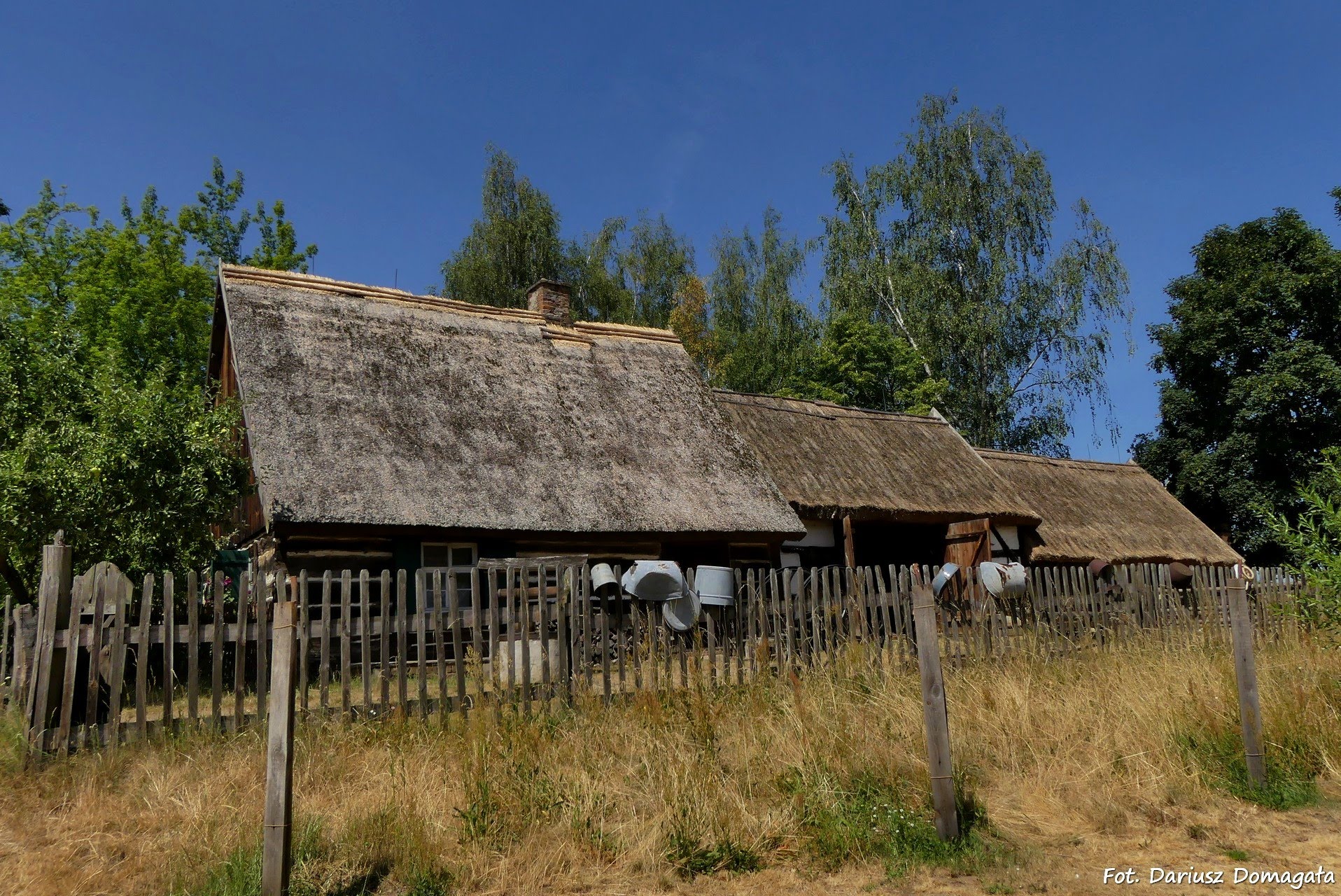 Cechą charakterystyczną całej zagrody jest to, że pod jednym dachem krytym trzciną i słomą umieszczone są zarówno chałupa, jaki i stodoła i chlew z wozownią (fot.).