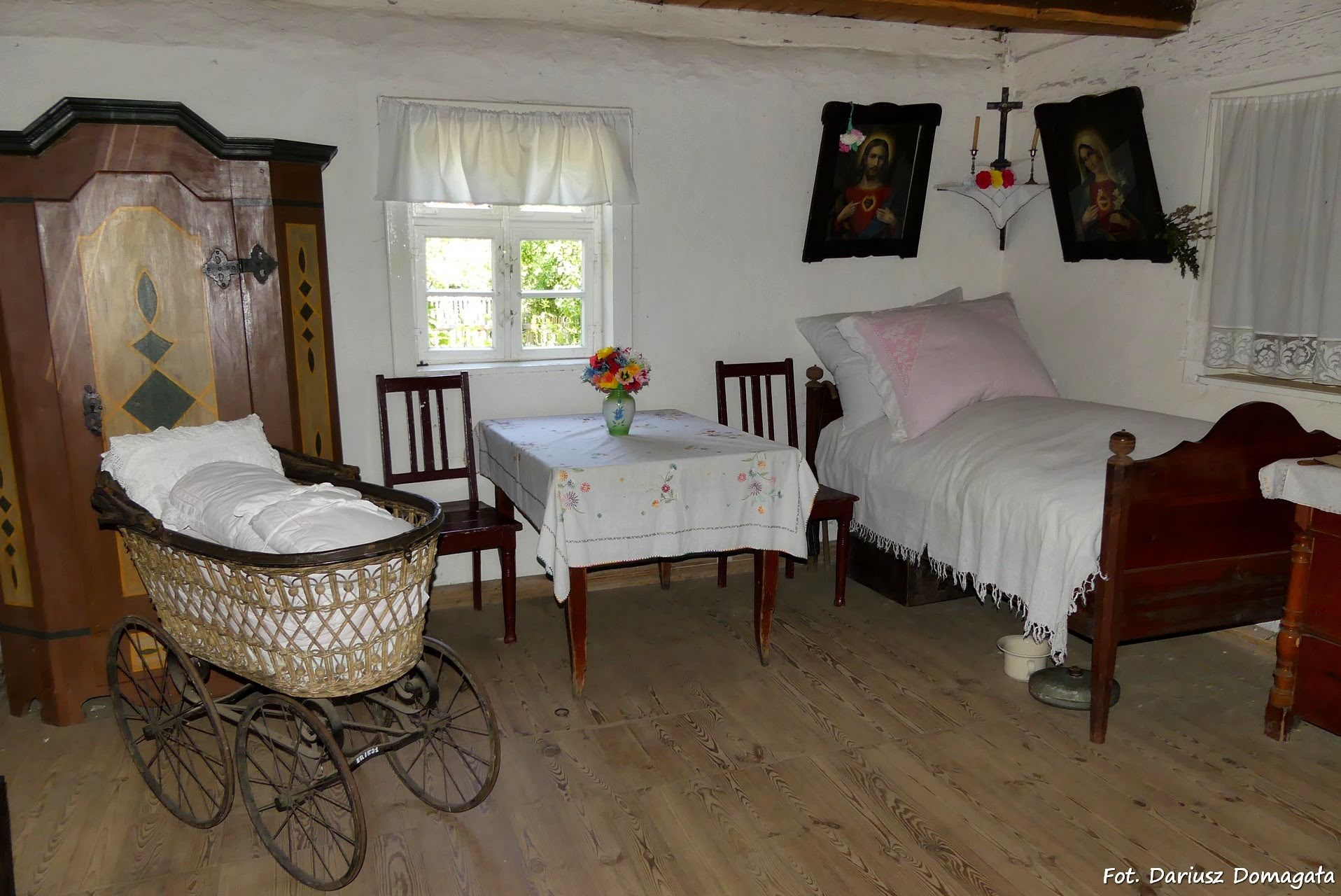 podłogi, natomiast w sieni i kuchni ceglaste. W większej z izb odtworzono oryginalny układ rozmieszczenia przedmiotów