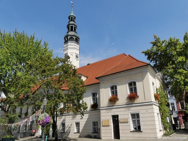 Nad ratuszem góruje gotycko-barokowa wieża z połowy XVI wieku, w 1582 roku podwyższona do wysokości 54 metrów. Nakrywa ją barokowy hełm z trzema latarniami. Obecnie w ratuszu mieści się Sala Ślubów i obraduje tutaj Rada Miasta.