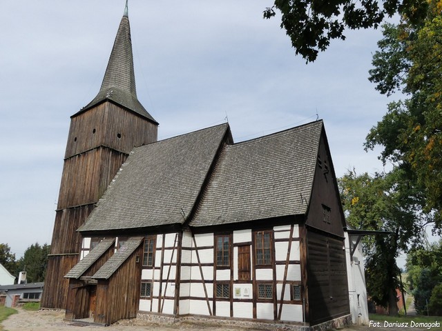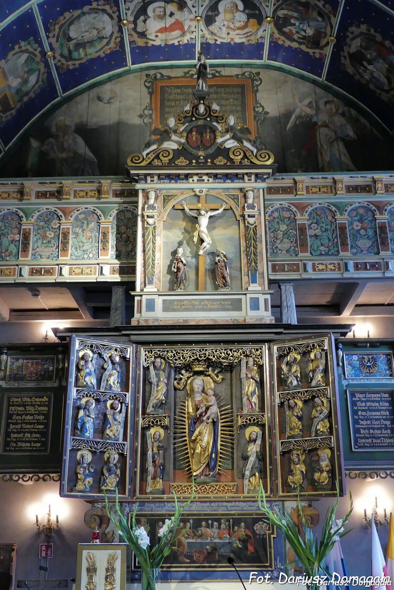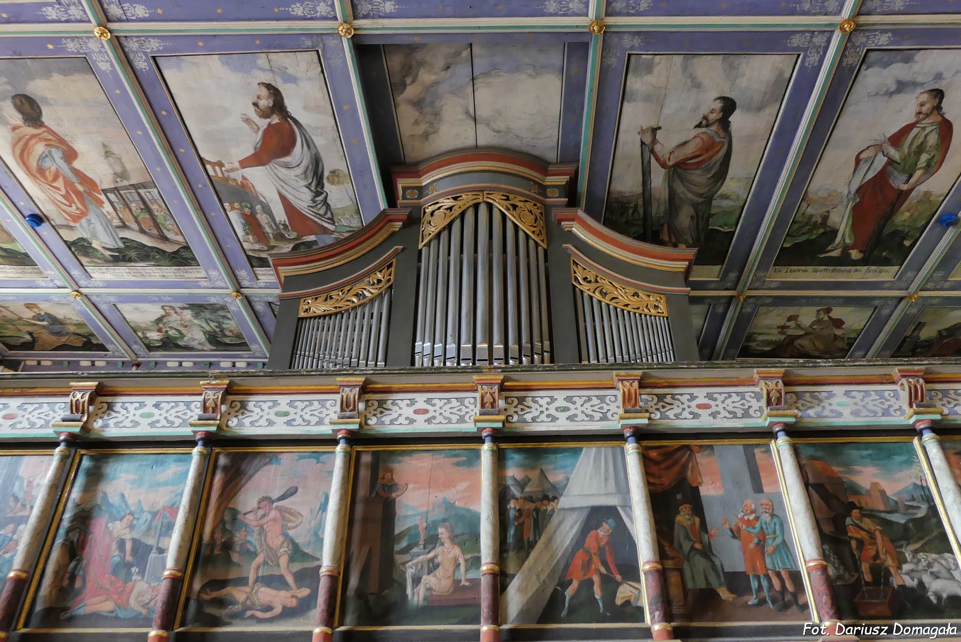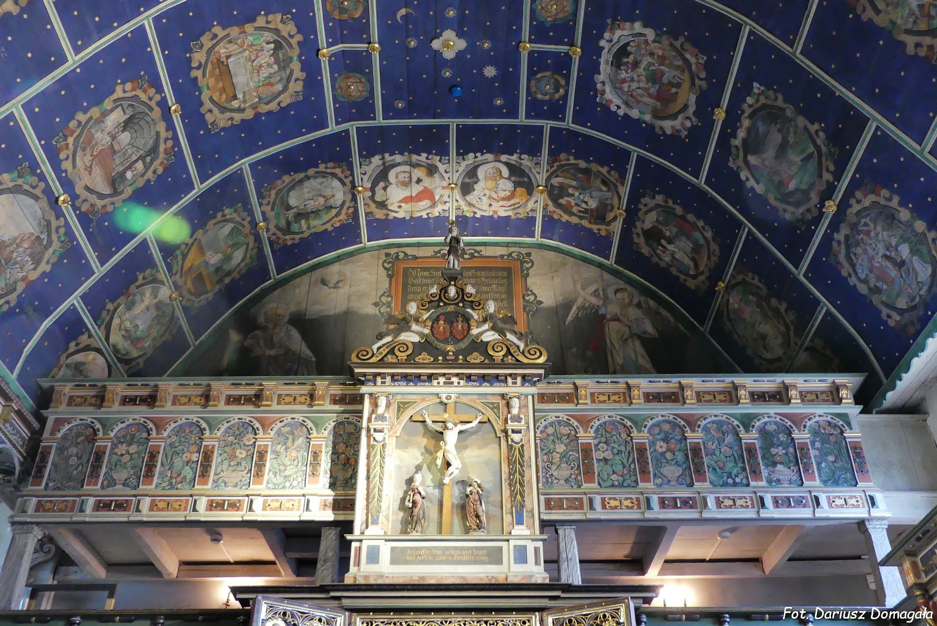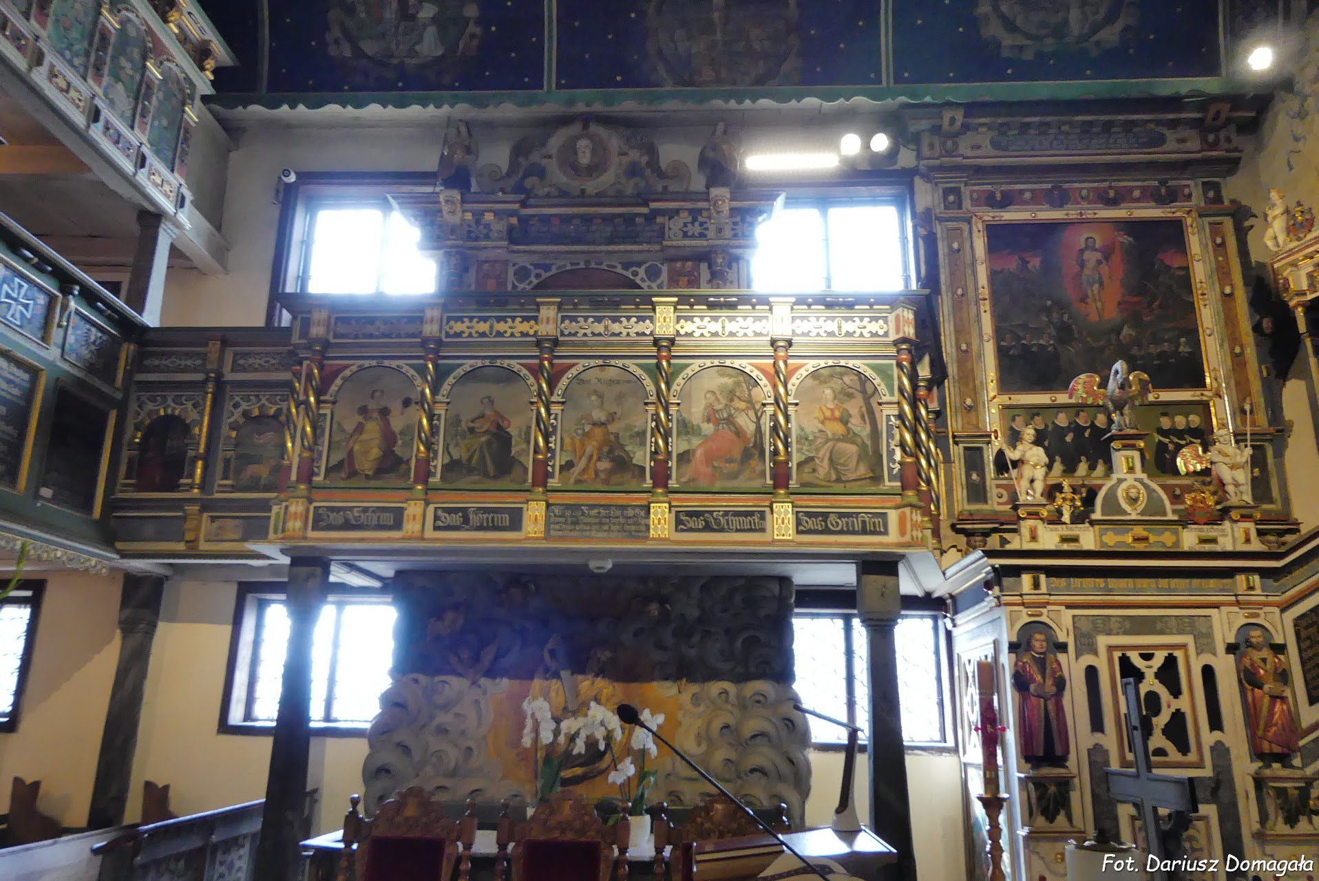Wnętrze kościoła wraz z pełnym wyposażeniem przetrwało w stanie niemal niezmienionym do dzisiaj. Po II wojnie światowej kościół w Klępsku został przejęty przez katolików. W 2017 roku decyzją Prezydenta RP kościół w Klępsku został wpisany na listę Pomników Historii. Kościół jest orientowany i składa się z głównego korpusu nawowego, nieco węższego i niższego prezbiterium zamkniętego prostokątnie oraz wieży od strony zachodniej (fot.) (fot.) (fot.). Przy północnej ścianie prezbiterium znajduje się murowana zakrystia. Nawa i prezbiterium przykryte są dwuspadowymi dachami krytymi gontem, wieża kościoła zwieńczona jest wysokim iglicowym hełmem. Ściany wschodnia i zachodnia, o konstrukcji wieńcowej, od wewnątrz pokryte są gliną, natomiast dłuższe północna i południowa, o konstrukcji szkieletowej, wypełnione są cegłą. Pod zakrystią znajduje się kolebkowo sklepiona krypta. Najcenniejszy elementem kościoła jest wielobarwny wystrój malarsko-snycerski (złożony ze 117 malowideł oraz opatrzony 90 inskrypcjami) oraz wyposażenie wnętrza. W prezbiterium znajduje się gotycki ołtarz z około 1400 roku z figurą Matki Boskiej z Dzieciątkiem koronowanej przez anioły i otoczonej gronem świętych (fot.) (fot.), uzupełniony o predellę przedstawiającą Ostatnią Wieczerzę oraz grupę Ukrzyżowania w zwieńczeniu (fot.). Cennym elementem jest chrzcielnica z 1581 roku dekorowana scenami figuralnym i cytatami z Pisma Świętego (fot.). Bogato dekorowana ambona z 1614 roku zawiera rzeźbiarskie przedstawienia czterech ewangelistów (fot.), działaczy reformacyjnych, Marcina Lutra i Filipa Melanchtona (fot.) oraz wizerunkiem Trójcy Świętej na podniebieniu baldachimu. Bogata jest dekoracja parapetów empor. Parapet najstarszej południowej empory dekorowany jest scenami Stworzenia Pierwszych Rodziców (fot.), parapet empory zachodniej cyklem przedstawień inspirowanych tematyką Dziesięciorga Przykazań (fot.). Dwie empory północne w prezbiterium ozdabia cykl malowideł odnoszący się do cudów Chrystusa oraz wielkich grzeszników stanowiących wzór szczerej pokuty (fot.), zaś emporę południową w prezbiterium personifikacje zmysłów oraz przedstawienia odnoszące się do chwały życia wiecznego (fot.). Poszczególne sceny oddzielone są od siebie kolumienkami, a całość uzupełniają elementy ornamentyki roślinnej i geometrycznej. Przepiękne są również malowidła stropów nawy i prezbiterium. Na stropie nawy ukazano proroków i apostołów oraz personifikacje cnót chrześcijańskich i kardynalnych (fot.) (fot.). W prezbiterium na górnej części zachodniej ściany szczytowej znajduje się scena Sądu Ostatecznego (fot.), na wschodniej ścianie szczytowej Zwiastowanie, a pomiędzy nimi, na grzbiecie pozornego sklepienia kolebkowego, na rozgwieżdżonym niebieskim tle ukazane zostały wizerunki czterech ewangelistów, scena Zmartwychwstania oraz sceny ze Starego i Nowego Testamentu (fot.) (fot.). Wewnątrz kościoła występuje 90 inskrypcji umieszczonych na obrazach i płytach kamiennych (fot.). Występują również inskrypcje związane z właścicielami wsi oraz fundatorami, którzy przyczynili się do wzbogacenia kościoła. Do oryginalnych elementów wyposażenia wnętrza należą również bogato dekorowane stalle. Kościół jest udostępniony do zwiedzania przez cały rok. Numer telefonu do pani, która otwiera kościół i opowie o jego historii wisi przy wejściu (pani Ewa). Dobrym pomysłem jest też zwiedzanie kościoła po niedzielnej mszy św. o godzinie 11.30 (w internecie często podawane są błędne godziny tej mszy). Kościół można zwiedzić za darmo, ale mile widziane są drobne datki (cegiełki) na utrzymanie kościoła. Kościół w Klępsku jest kościołem filialnym parafii św. Stanisława Biskupa w Łęgowie Sulechowskim. Klępsk to wieś w gminie Sulechów, w powiecie zielonogórskim, w województwie lubuskim. Wieś położona jest w odległości około 30 km na północny wschód od Zielonej Góry. 02.2026 Na podstawie stron internetowych: Kościół w Kosieczynie w Wikipedii, Kościół w Chlastawie w Wikipedii, zabytek.pl - kościół w Klępsku. Aktualizacja 14.02.2026 |