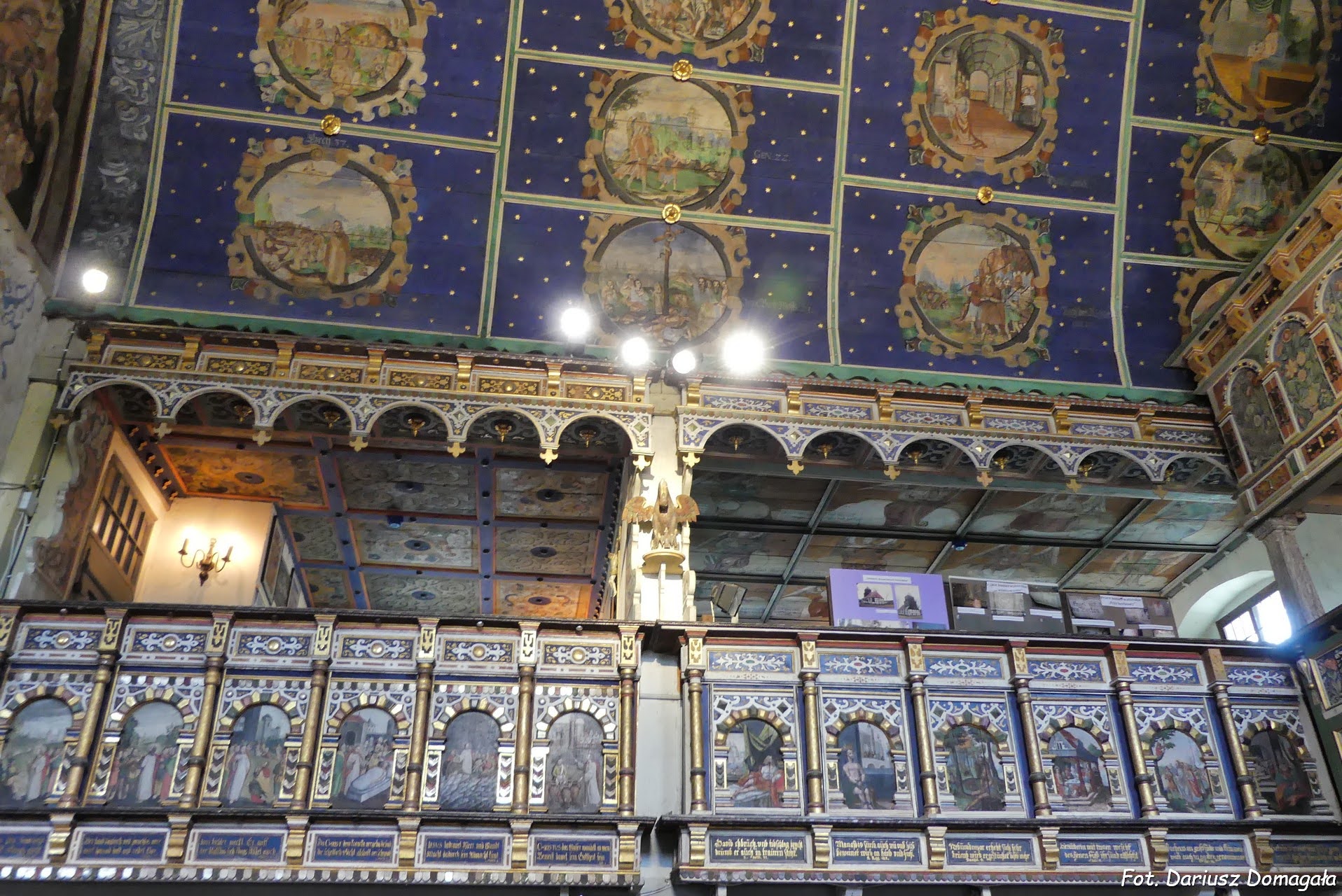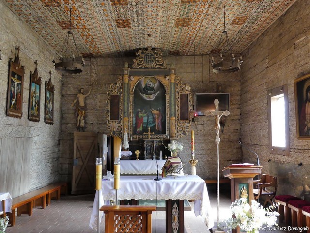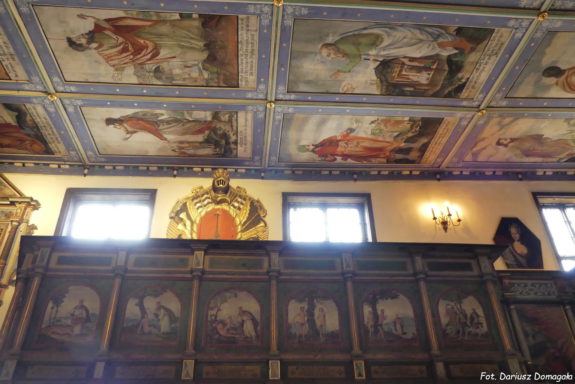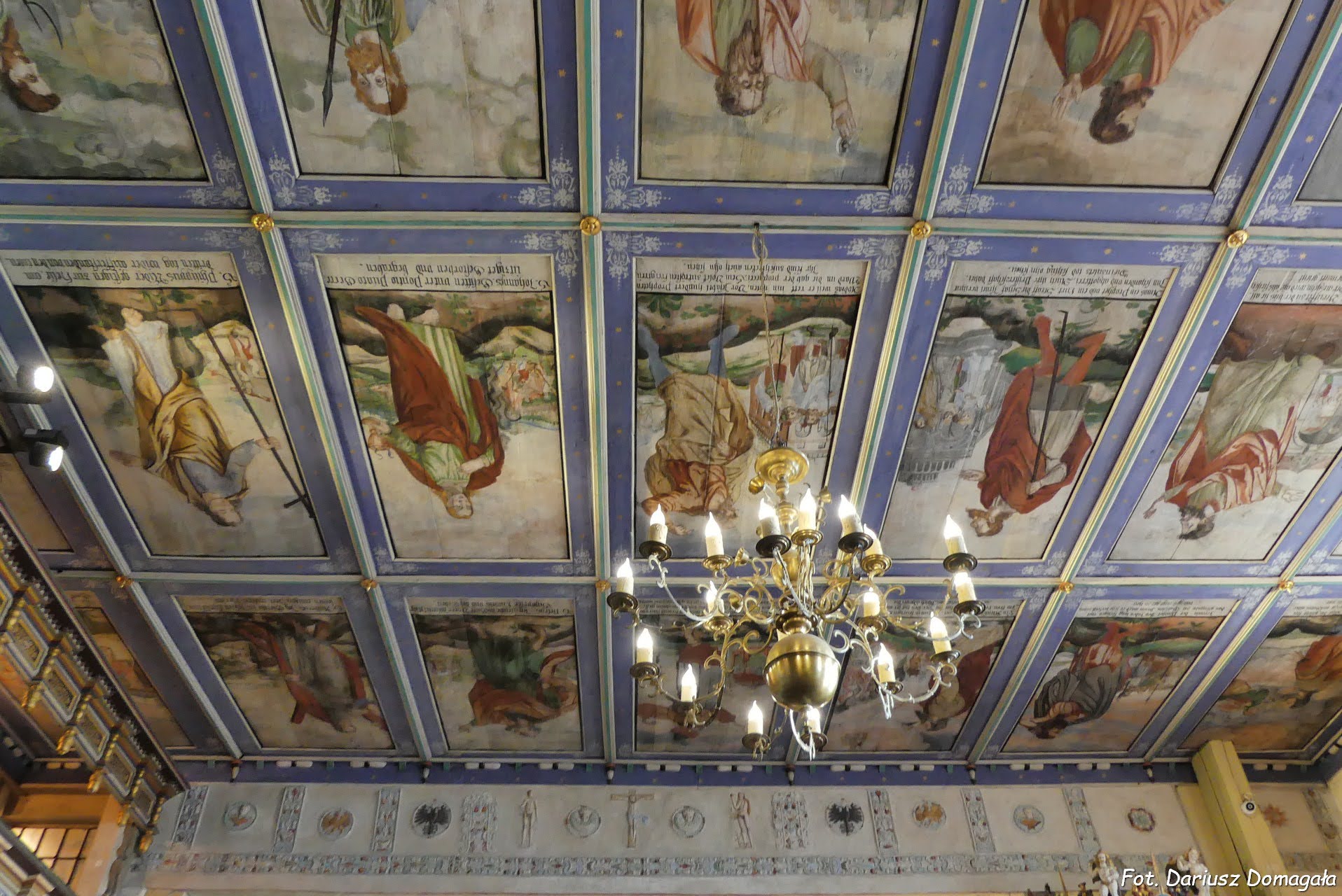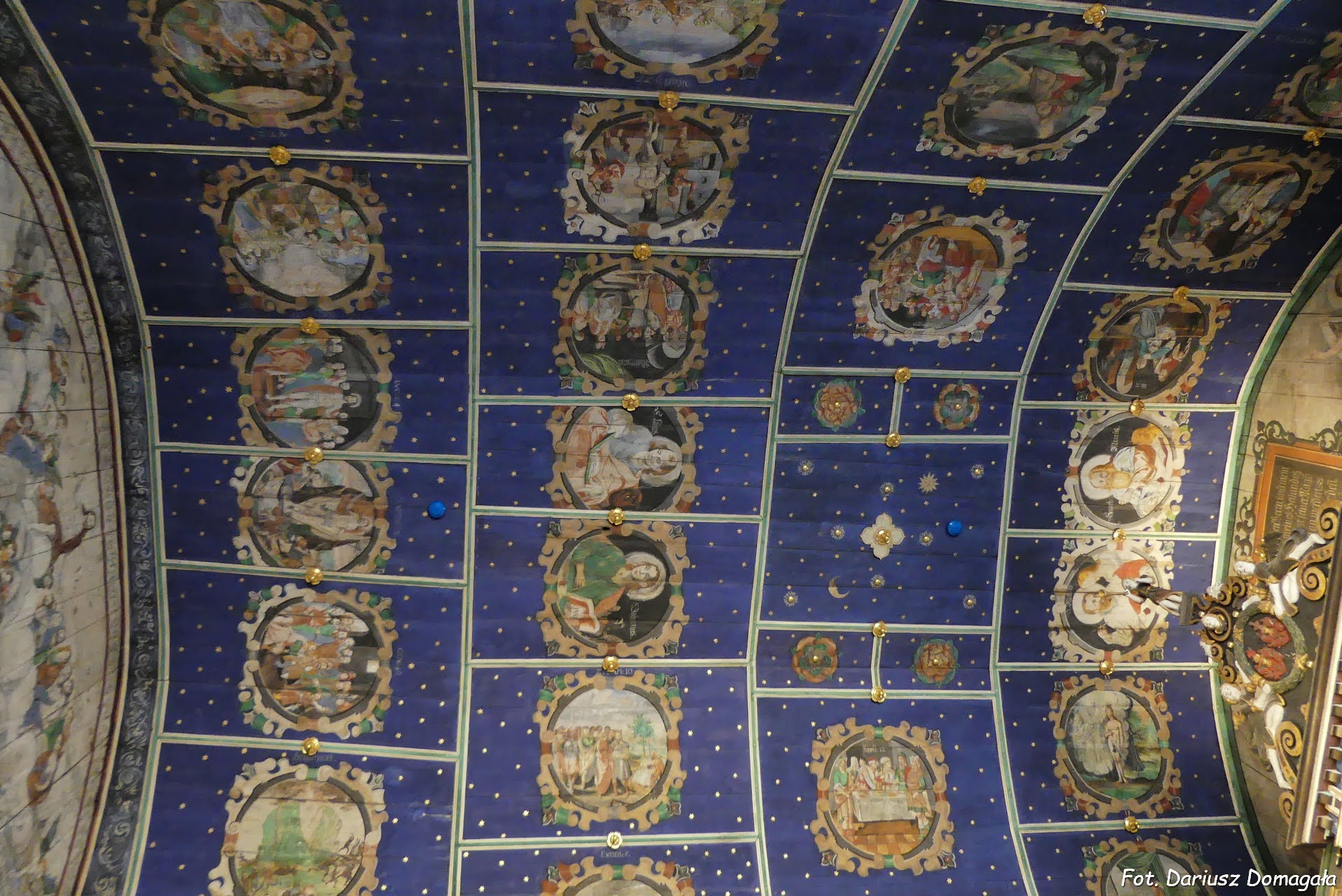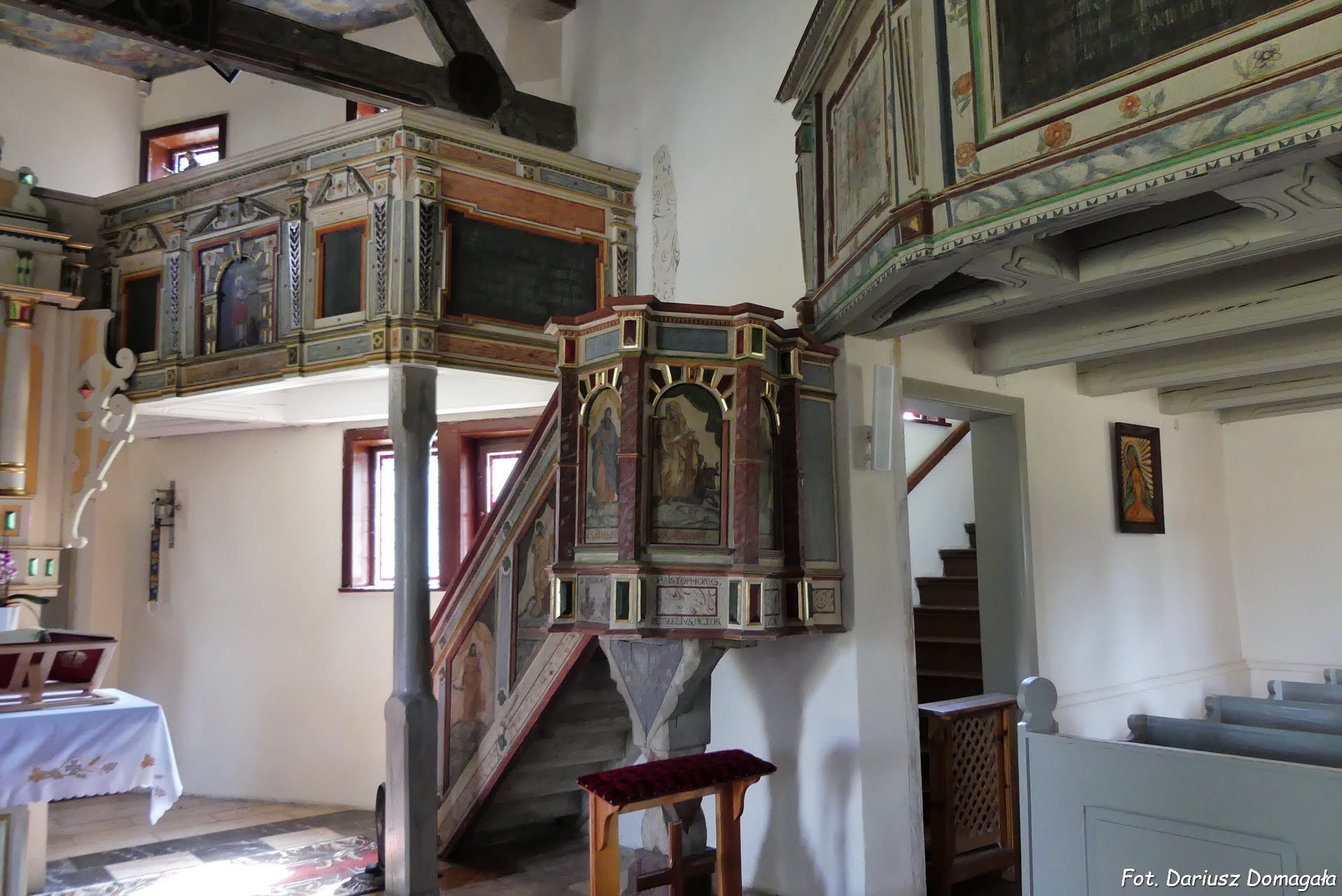 Wnętrze kościoła wraz z pełnym wyposażeniem przetrwało w stanie niemal niezmienionym do dzisiaj. Po II wojnie światowej kościół w Klępsku został przejęty przez katolików. W 2017 roku decyzją Prezydenta RP kościół w Klępsku został wpisany na listę Pomników Historii. Kościół jest orientowany i składa się z głównego korpusu nawowego, nieco węższego i niższego prezbiterium zamkniętego prostokątnie oraz wieży od strony zachodniej (fot.) (fot.) (fot.). Przy północnej ścianie prezbiterium znajduje się murowana zakrystia. Nawa i prezbiterium przykryte są dwuspadowymi dachami krytymi gontem, wieża kościoła zwieńczona jest wysokim iglicowym hełmem. Ściany wschodnia i zachodnia, o konstrukcji wieńcowej, od wewnątrz pokryte są gliną, natomiast dłuższe północna i południowa, o konstrukcji szkieletowej, wypełnione są cegłą. Pod zakrystią znajduje się kolebkowo sklepiona krypta. Najcenniejszy elementem kościoła jest wielobarwny wystrój malarsko-snycerski (złożony ze 117 malowideł oraz opatrzony 90 inskrypcjami) oraz wyposażenie wnętrza. W prezbiterium znajduje się gotycki ołtarz z około 1400 roku z figurą Matki Boskiej z Dzieciątkiem koronowanej przez anioły i otoczonej gronem świętych (fot.) (fot.), uzupełniony o predellę przedstawiającą Ostatnią Wieczerzę oraz grupę Ukrzyżowania w zwieńczeniu (fot.). Cennym elementem jest chrzcielnica z 1581 roku dekorowana scenami figuralnym i cytatami z Pisma Świętego (fot.). Bogato dekorowana ambona z 1614 roku zawiera rzeźbiarskie przedstawienia czterech ewangelistów (fot.), działaczy reformacyjnych, Marcina Lutra i Filipa Melanchtona (fot.) oraz wizerunkiem Trójcy Świętej na podniebieniu baldachimu. Bogata jest dekoracja parapetów empor. Parapet najstarszej południowej empory dekorowany jest scenami Stworzenia Pierwszych Rodziców (fot.), parapet empory zachodniej cyklem przedstawień inspirowanych tematyką Dziesięciorga Przykazań (fot.). Dwie empory północne w prezbiterium ozdabia cykl malowideł odnoszący się do cudów Chrystusa oraz wielkich grzeszników stanowiących wzór szczerej pokuty (fot.), zaś emporę południową w prezbiterium personifikacje zmysłów oraz przedstawienia odnoszące się do chwały życia wiecznego (fot.). Poszczególne sceny oddzielone są od siebie kolumienkami, a całość uzupełniają elementy ornamentyki roślinnej i geometrycznej. Przepiękne są również malowidła stropów nawy i prezbiterium. Na stropie nawy ukazano proroków i apostołów oraz personifikacje cnót chrześcijańskich i kardynalnych (fot.) (fot.). W prezbiterium na górnej części zachodniej ściany szczytowej znajduje się scena Sądu Ostatecznego (fot.), na wschodniej ścianie szczytowej Zwiastowanie, a pomiędzy nimi, na grzbiecie pozornego sklepienia kolebkowego, na rozgwieżdżonym niebieskim tle ukazane zostały wizerunki czterech ewangelistów, scena Zmartwychwstania oraz sceny ze Starego i Nowego Testamentu (fot.) (fot.). Wewnątrz kościoła występuje 90 inskrypcji umieszczonych na obrazach i płytach kamiennych (fot.). Występują również inskrypcje związane z właścicielami wsi oraz fundatorami, którzy przyczynili się do wzbogacenia kościoła. Do oryginalnych elementów wyposażenia wnętrza należą również bogato dekorowane stalle. Kościół jest udostępniony do zwiedzania przez cały rok. Numer telefonu do pani, która otwiera kościół i opowie o jego historii wisi przy wejściu (pani Ewa). Dobrym pomysłem jest też zwiedzanie kościoła po niedzielnej mszy św. o godzinie 11.30 (w internecie często podawane są błędne godziny tej mszy). Kościół można zwiedzić za darmo, ale mile widziane są drobne datki (cegiełki) na utrzymanie kościoła. Kościół w Klępsku jest kościołem filialnym parafii św. Stanisława Biskupa w Łęgowie Sulechowskim. Klępsk to wieś w gminie Sulechów, w powiecie zielonogórskim, w województwie lubuskim. Wieś położona jest w odległości około 30 km na północny wschód od Zielonej Góry. 02.2026 Na podstawie stron internetowych: Kościół w Kosieczynie w Wikipedii, Kościół w Chlastawie w Wikipedii, zabytek.pl - kościół w Klępsku. Aktualizacja 14.02.2026 |